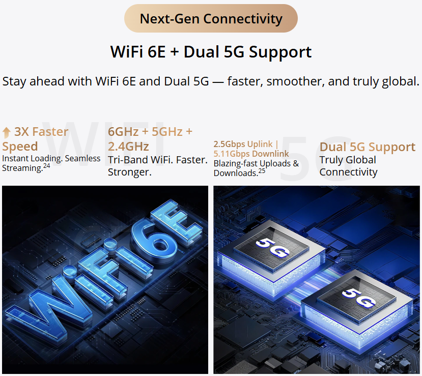 Wireless: Wi-Fi 6E, Bluetooth BT 5.4, NFC