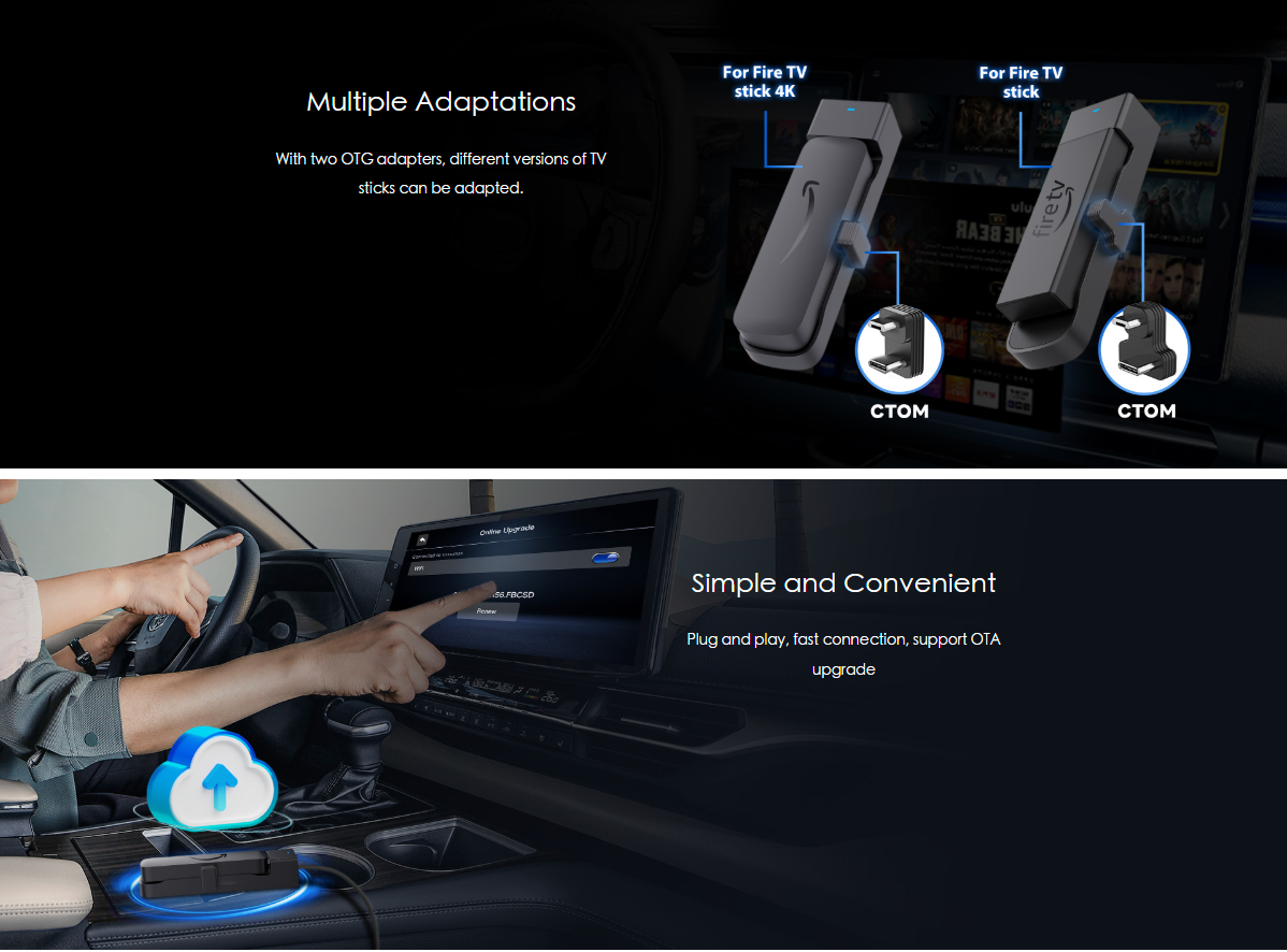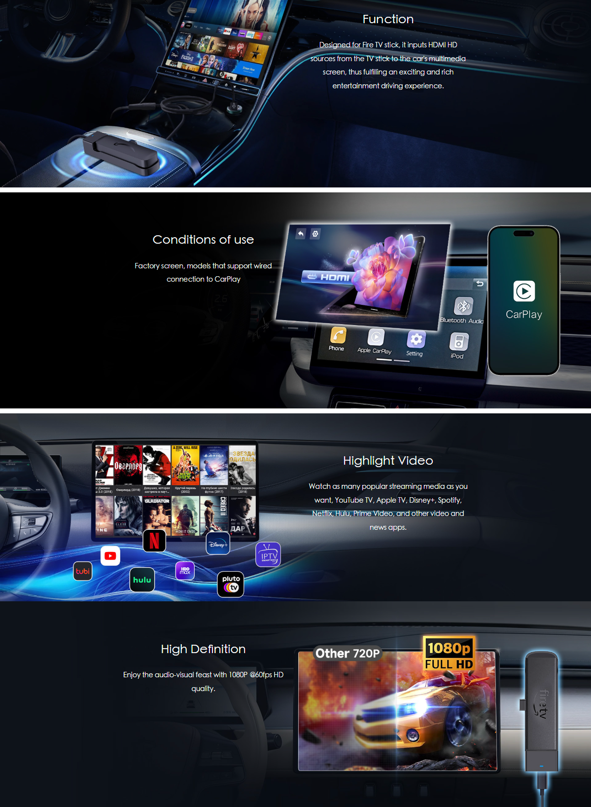 Carlinkit FireDrive Link este un adaptor auto compact compatibil cu masini cu CarPlay prin cablu. Suporta rezolutie HD 1080P, conexiune WiFi 2.4G, HDMI, USB si functii precum muzica, video, apeluri si navigare. Culoare: negru, textura mata fina.