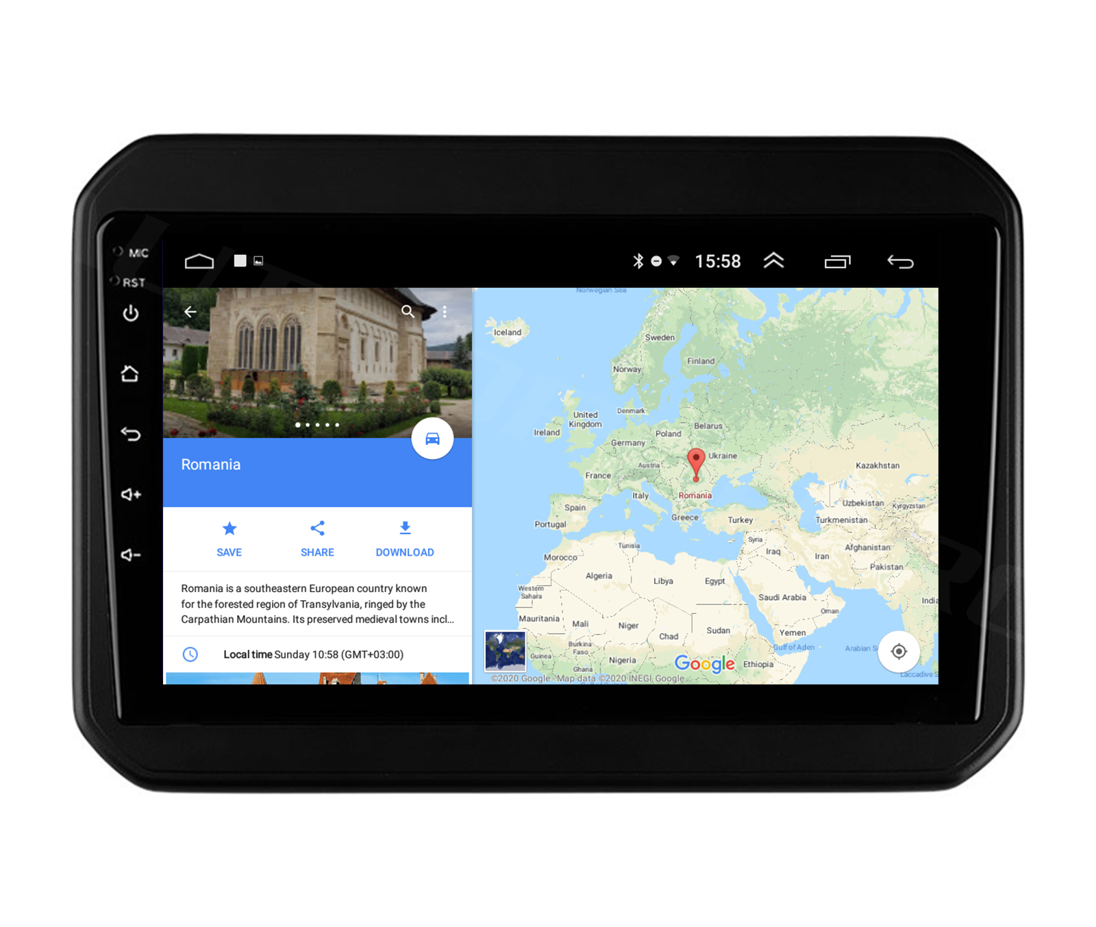 Suport online și offline pentru Navigatia GPS, susține Hărti 3D și îndrumare vocală în diverse limbi disponibile, majoritatea deja setate în limbă romană.