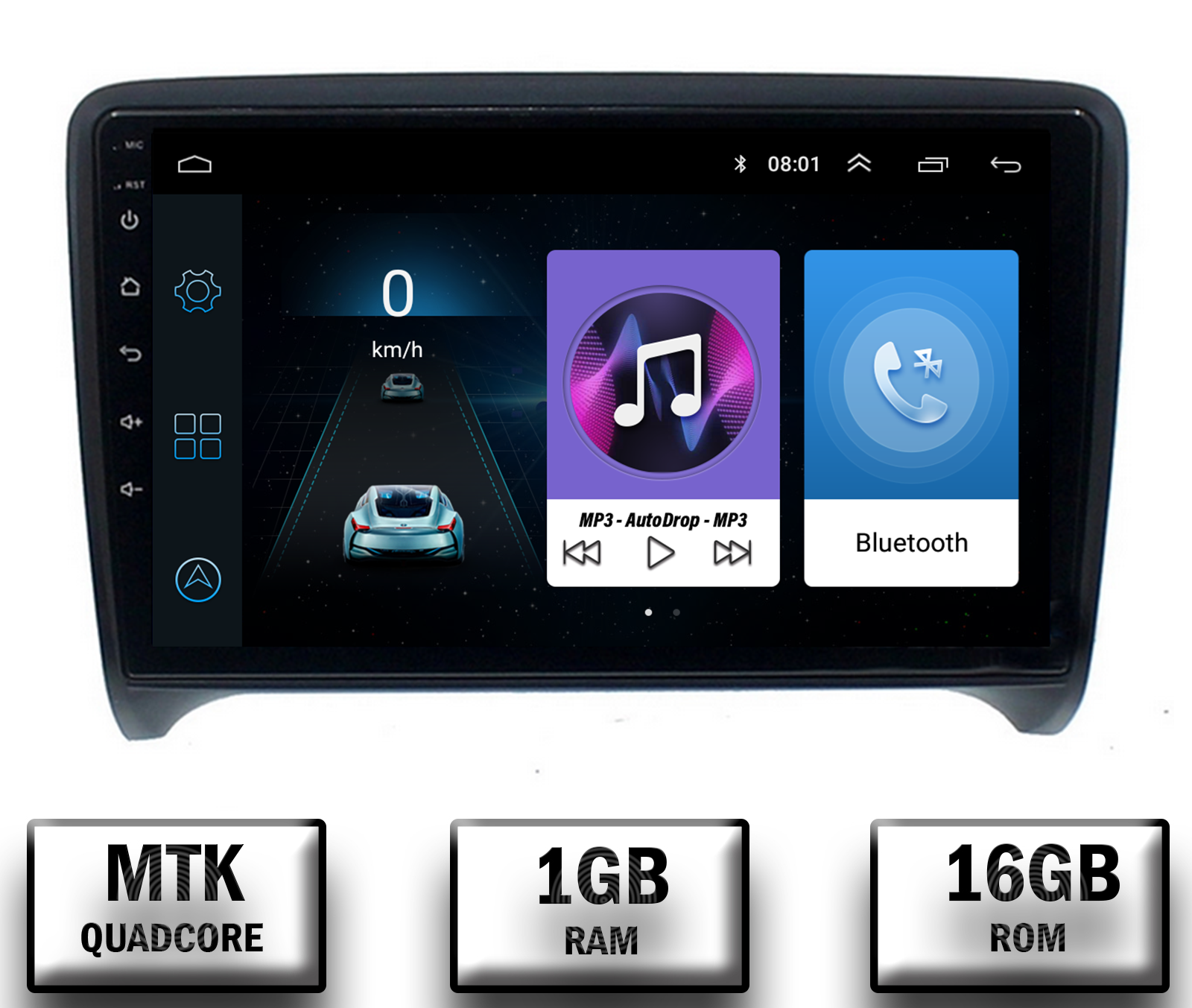 Sistem Operare Android 10, RAM: 1 GB, MEMORIE INTERNĂ: 16GB, CPU: Mediatek 8227L 1,3GHZx4 , Cip radio de inaltă calitate IC: NXP 6851 și Amplificator IC AC7315.