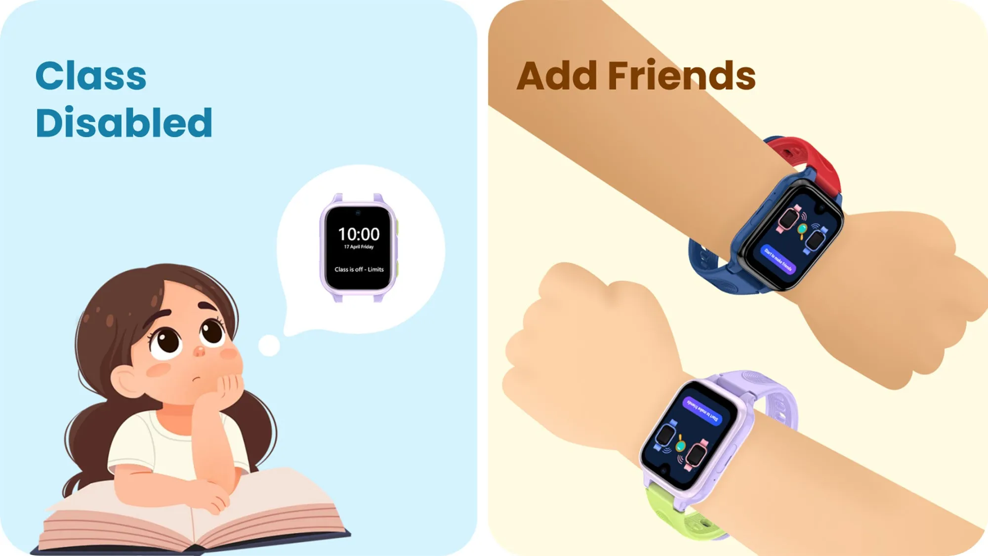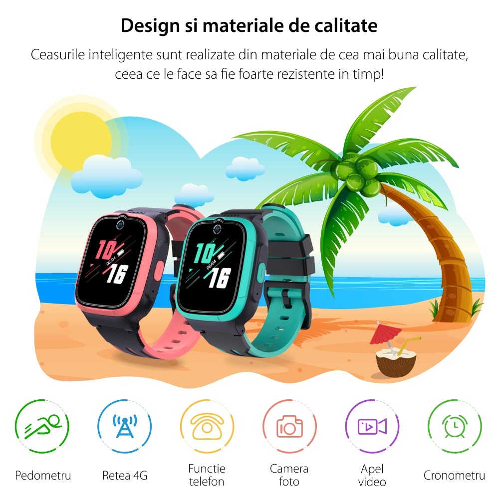 Ceasurile sunt colorate, rezistente la apă (IP68) și construite pentru copii activi.