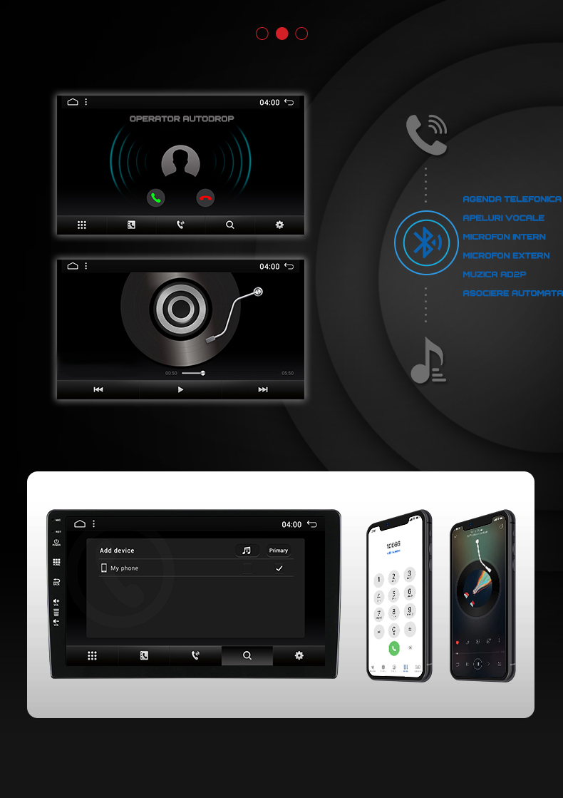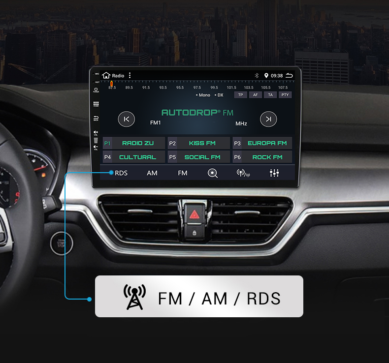 ● Functia RADIO FM/AM cu afisaj RDS, salvare posturi radio pe pagina principala.