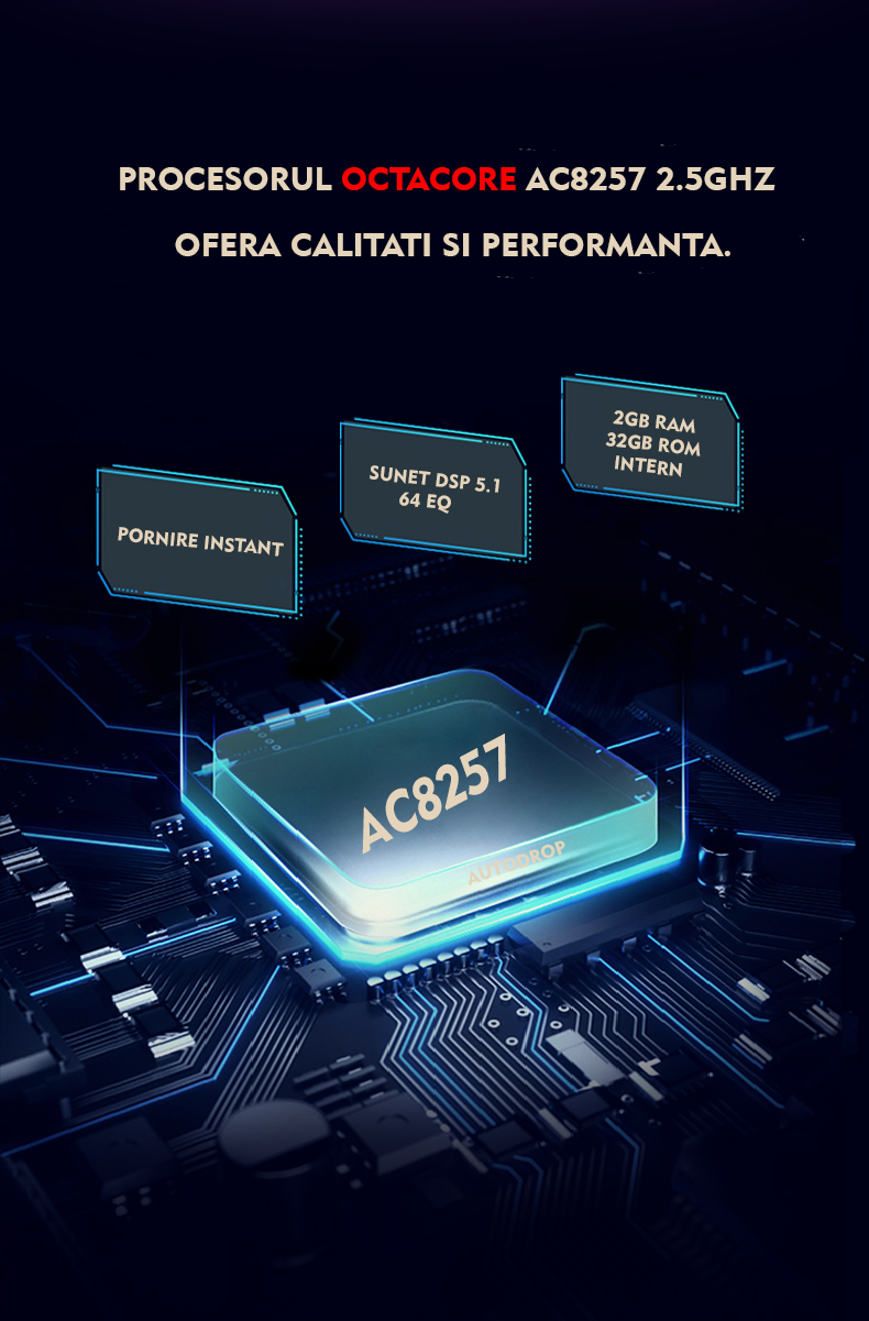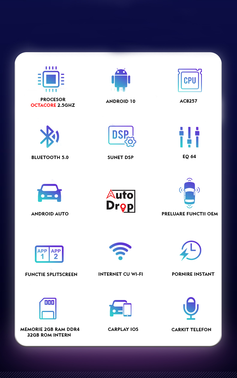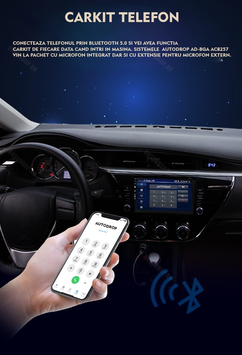 Seria AD-BGA creată de AutoDrop vă pune la dispoziţie o configuraţie multimedia auto de excepţie, cu un sistem de operare Android 12 real, procesor OCTACORE AC8257 2.5GHZ cu 2GB RAM şi 32GB ROM pentru a obţine o performanţă ridicată în rularea aplicaţilor Android. Sistemele AD-BGA vin echipate cu componente şi funcţii premium. Facilităţi precum WIFI, GPS Online şi Offline, Intrare USB, Bluetooth 5.0, Ecran IPS HD, Video 4k, Funcţia CARPLAY şi Android Auto, Sunet DSP, Magazin Playstore, Posibilitate ataşare Camera Marşarier HD, DVR Înregistrare trafic, Senzori de parcare cu afişaj, preluare informaţii şi funcţii OEM ale autoturismului.