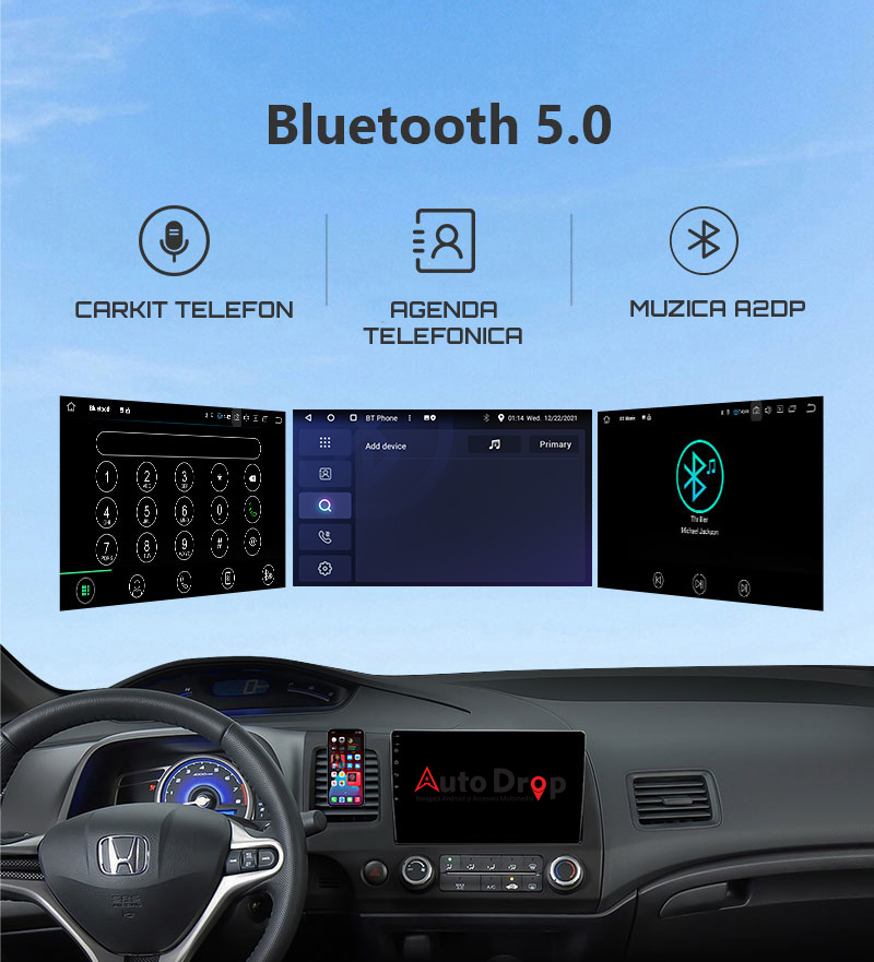 ● Bluetooth 5.0, Asociere iPhone si Android, agenda telefonica, Apeluri, Muzica A2DP direct din telefon.