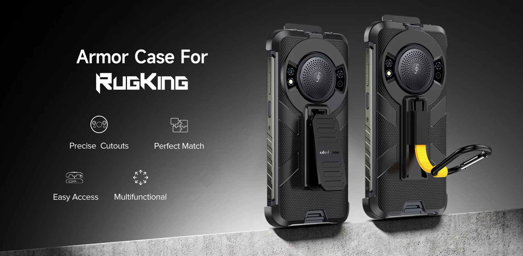 The Ulefone RugKing 3-in-1 protective case is made from durable PC. It provides protection and functionality with a 180° rotating clip and a carabiner. Perfect for outdoor use.