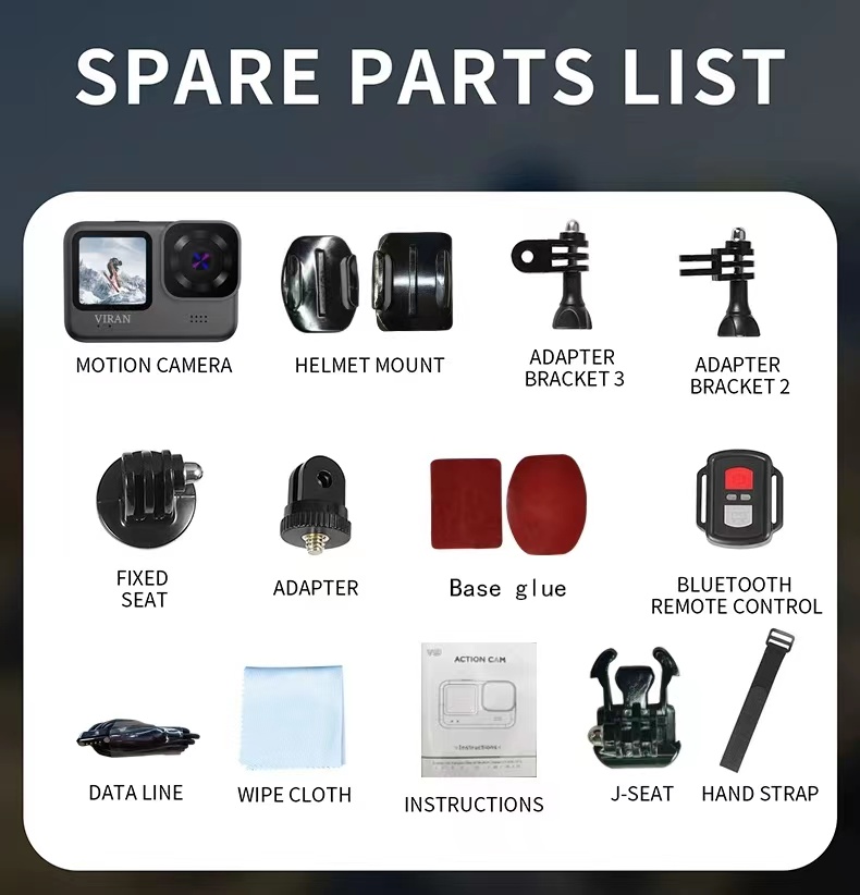 | 1x iSEN action camera 2x Helmet support 1x Adapter bracket 2 1X Adapter bracket 3 1x Fixed seat support 1x Adapter 1x bluetooth remote control 1x Data cable 1x Cuff 1x Cleaning cloth 1x J-seat 1x Hand support 1x Instruction manual |