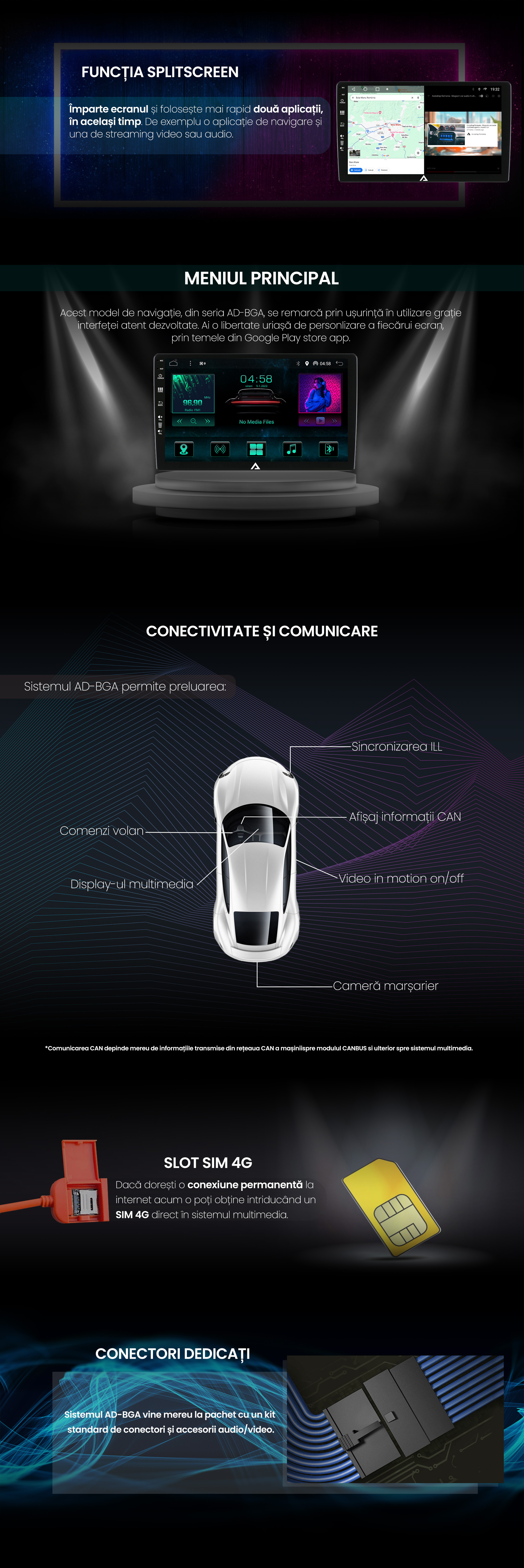 *Unele autoturisme pot necesita adaptări speciale, de exemplu un alt tip de chenar de încadrare sau conector alimentare. Aceste aspecte se discuta înainte de achiziție dacă este cazul și se pot remedia pe parcurs împreună cu suportul tehnic. Firma noastră își rezervă dreptul de a nu onora o comandă dacă consideră că un produs nu este cel puțin 95% compatibil și conform cu autoturismul în caz, indiferent de decizia clientului.