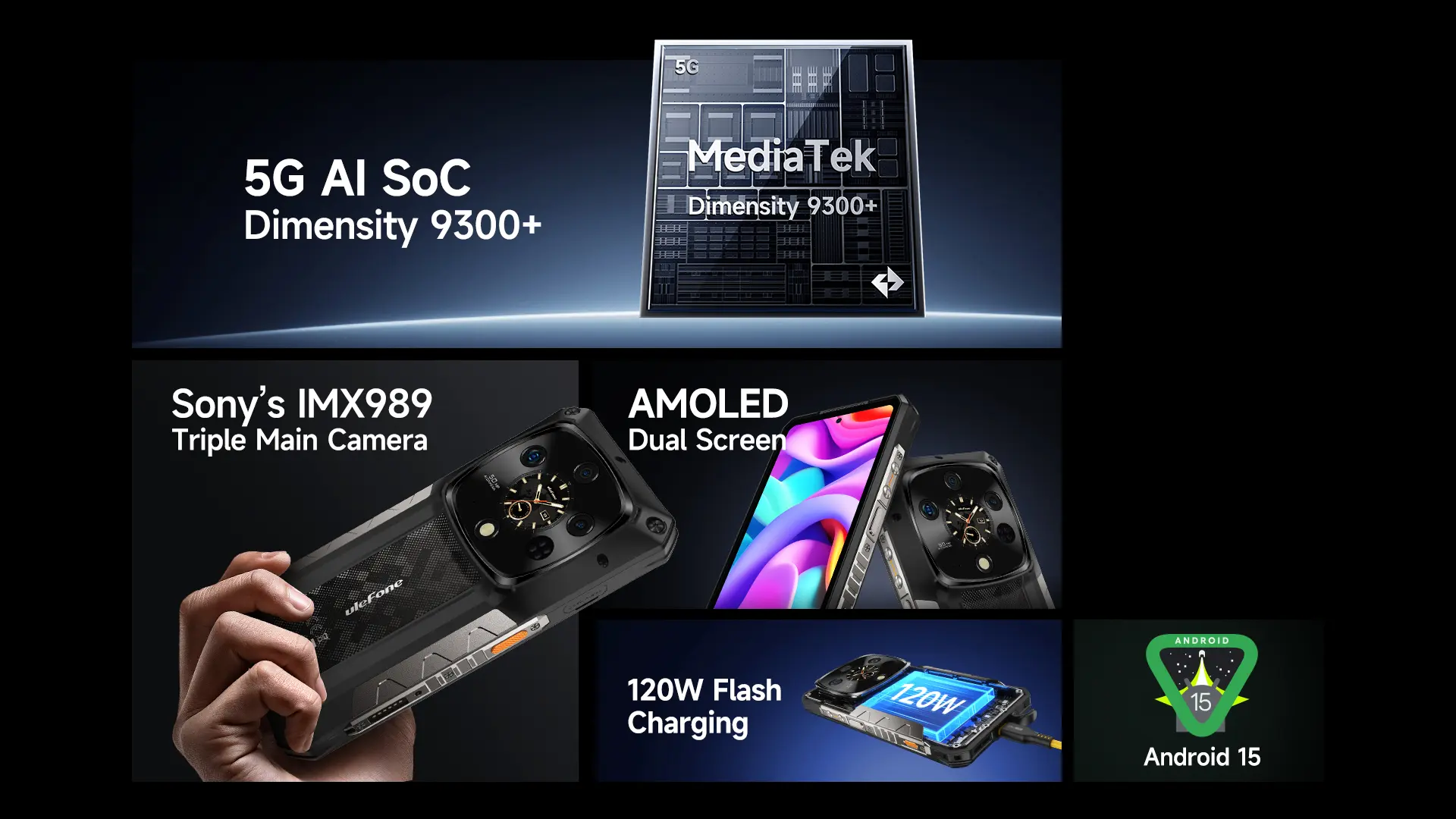 The Ulefone Armor 28 Ultra is a rugged smartphone designed for active users and professionals in fields like construction or exploration in extreme environments. It features a 6.67-inch AMOLED display, a MediaTek Dimensity 9300+ processor, 16GB of RAM, and 1TB of internal storage. The main camera includes a 50MP primary sensor, a 64MP night vision sensor. The 10600mAh battery supports 120W fast charging and 50W wireless charging.