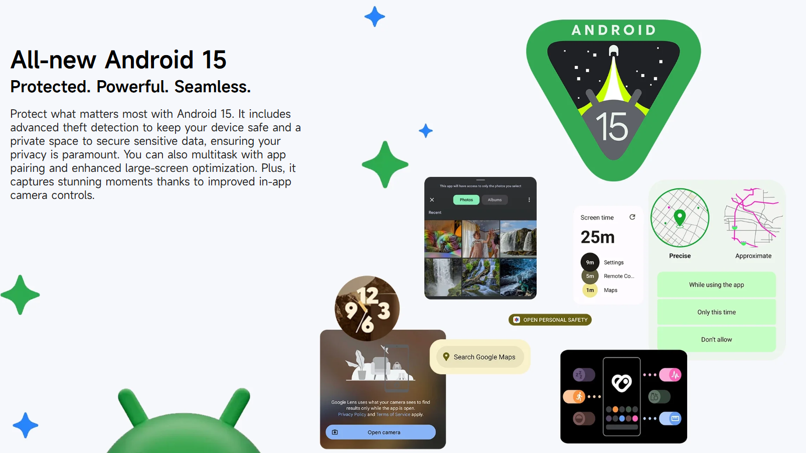 | Features | Rear camera modes: Normal, Night, 48MP, Portrait, Macro, Document correction, Beauty, Filter, AI Emoji, Gif, Film, Pro mode, Panorama, Slow motion, Time lapse, Intelligent scanning; Google lens, AI, HDR etc. Front camera modes: Normal, Portrait, Beauty, Filter, AI Emoji, GIF, Film; HDR, Gesture recognition etc. |