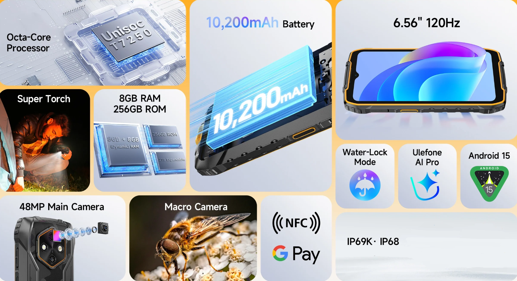 | Others | Notification Light: tri-color light, supports charging prompt Widevine L1 Toolbox FM Radio Custom Button AI Functions: Ulefone AI Pro, Gemini AI, ChatGPT, Grok Super Torch Flashlight |