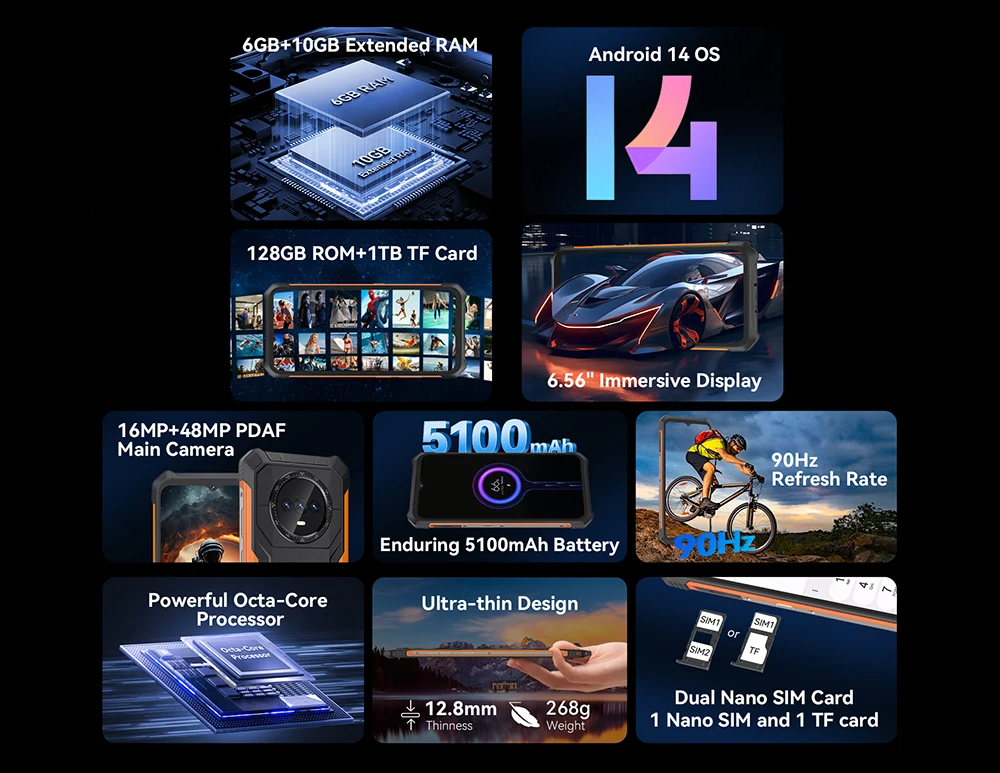 Mobile phone Cubot KingKong ES, Black, 5G, 6.56" HD+ 90Hz, 16GB RAM (6GB+10GB expandable), 128GB ROM, 48MP+2MP, Android 14, Unisoc T606, 5100mAh, Dual SIM