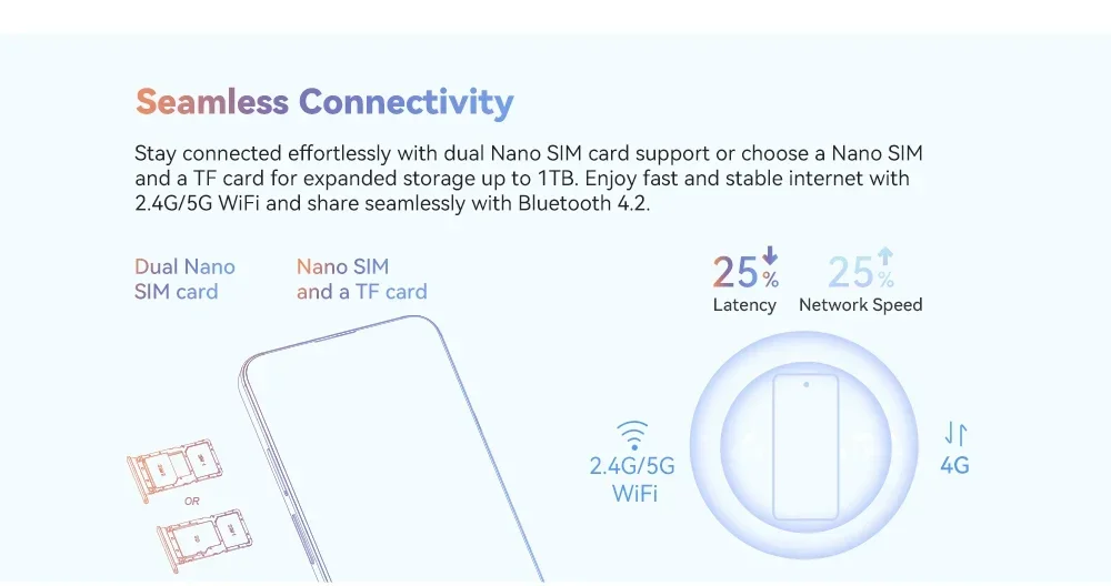 Stay connected effortlessly with dual Nano SIM card support or choose a Nano SIM and a TF card for expanded storage up to 1TB. Enjoy fast and stable internet with 2.4G/5G WiFi and share seamlessly with Bluetooth 4.2.