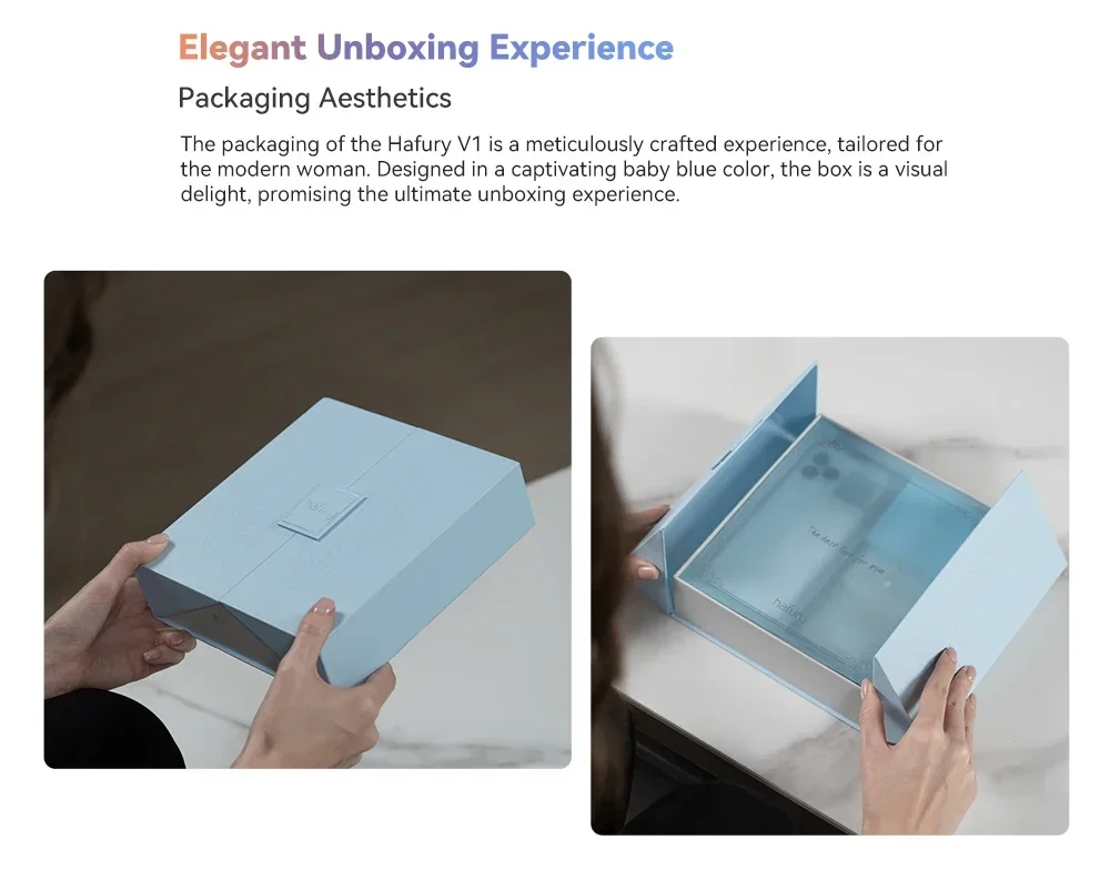 The packaging of the Hafury V1 is a meticulously crafted experience, tailored for the modern woman. Designed in a captivating baby blue