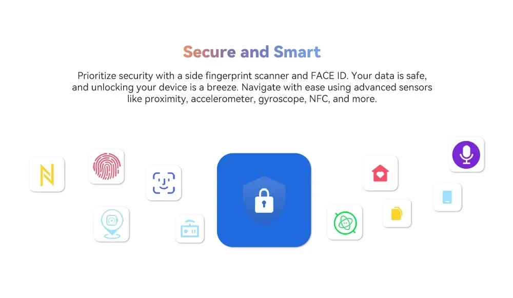 Prioritize security with a side fingerprint scanner and FACE ID. Your data is safe, and unlocking your device is a breeze. Navigate with ease using advanced sensors like proximity, accelerometer, gyroscope, NFC, and more.