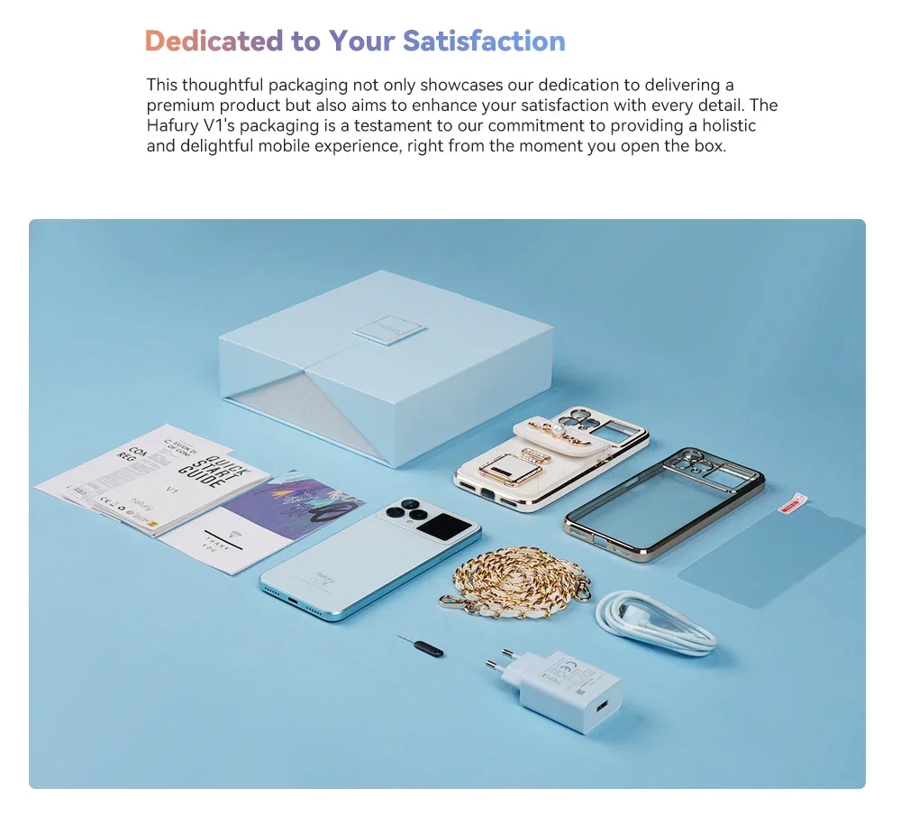 This thoughtful packaging not only showcases our dedication to delivering a premium product but also aims to enhance your satisfaction with every detail. The Hafury V1's packaging is a testament to our commitment to providing a holistic and delightful mobile experience, right from the moment you open the box.