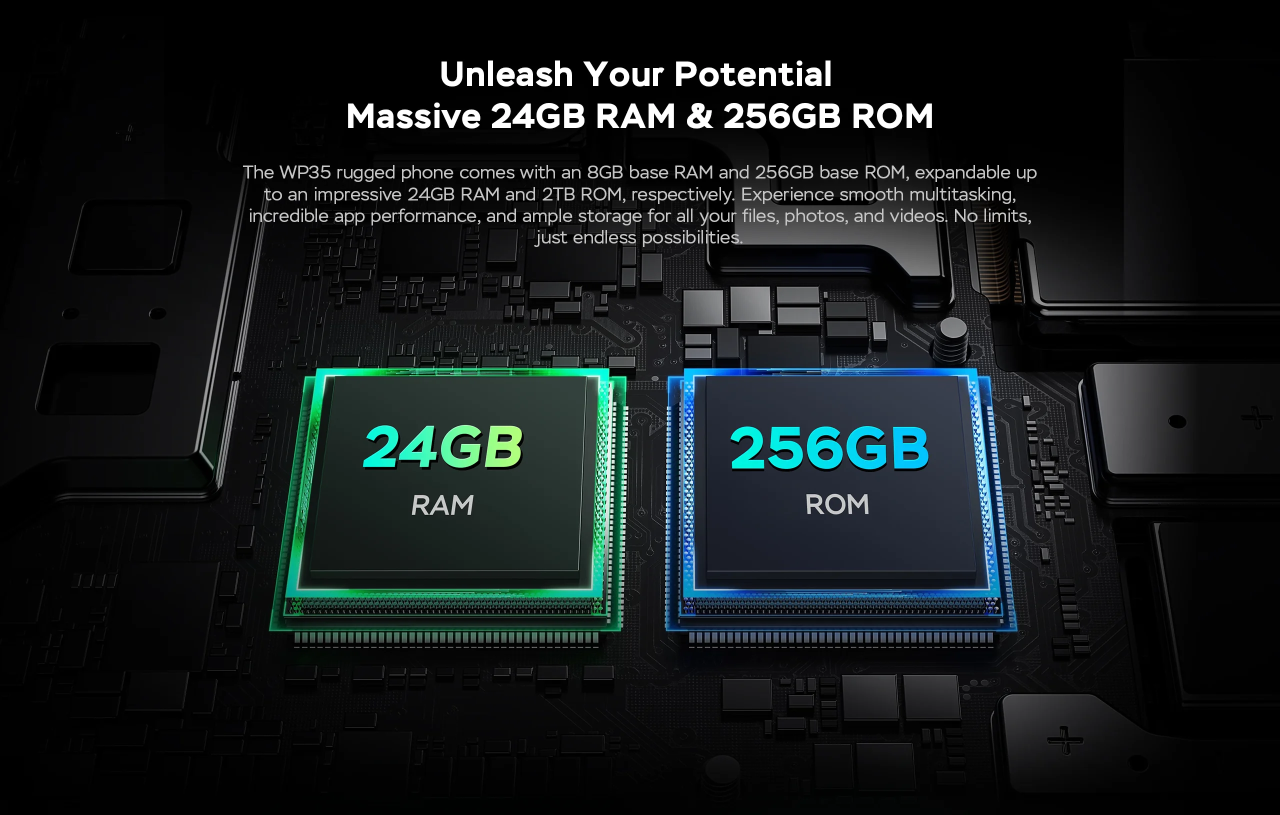 Discover the Oukitel WP39: a 5G mobile phone with a 6.60" FHD+ screen, 24GB RAM (6GB + 18GB expandable), 256GB ROM, Android 14, MTK Dimensity 6100+ processor, NFC, face unlock, fingerprint, 64MP camera, and 11000mAh battery. Dual SIM for maximum performance and versatility.