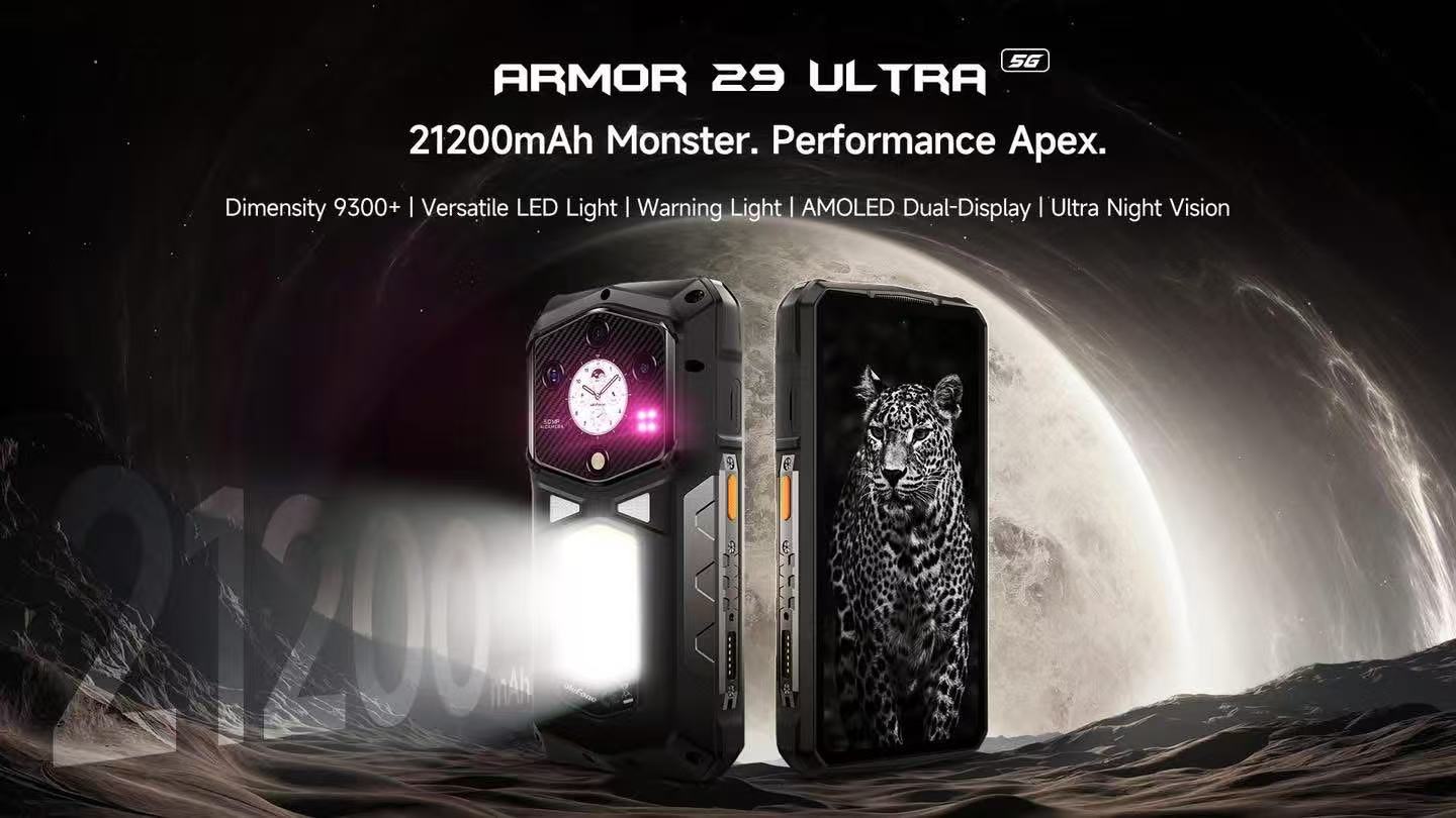 Ulefone ARMOR 29 Ultra in Marval Black offers massive 21200 mAh battery with 120 W fast charging and a 6.67‑inch 120 Hz AMOLED main display plus a 1.04‑inch AMOLED secondary screen. It features Dimensity 9300+ chipset, 16 GB RAM +16 GB virtual, 1 TB storage, triple camera setup (50+64+50 MP), and IP68/IP69K durability.