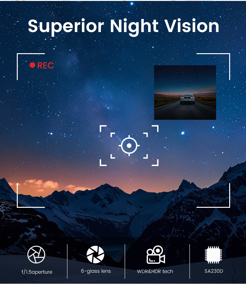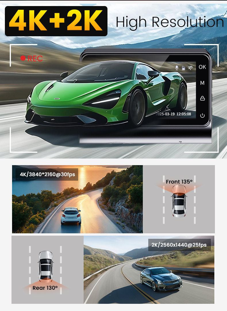 iSEN H002 autós kamera, 3" IPS kijelző, 4K 30fps elöl & 2K hátul, WiFi alkalmazásvezérlés, GPS nyomkövetés, G-szenzor, időeltolásos felvétel, parkolásfigyelés, elülső/hátsó kamera