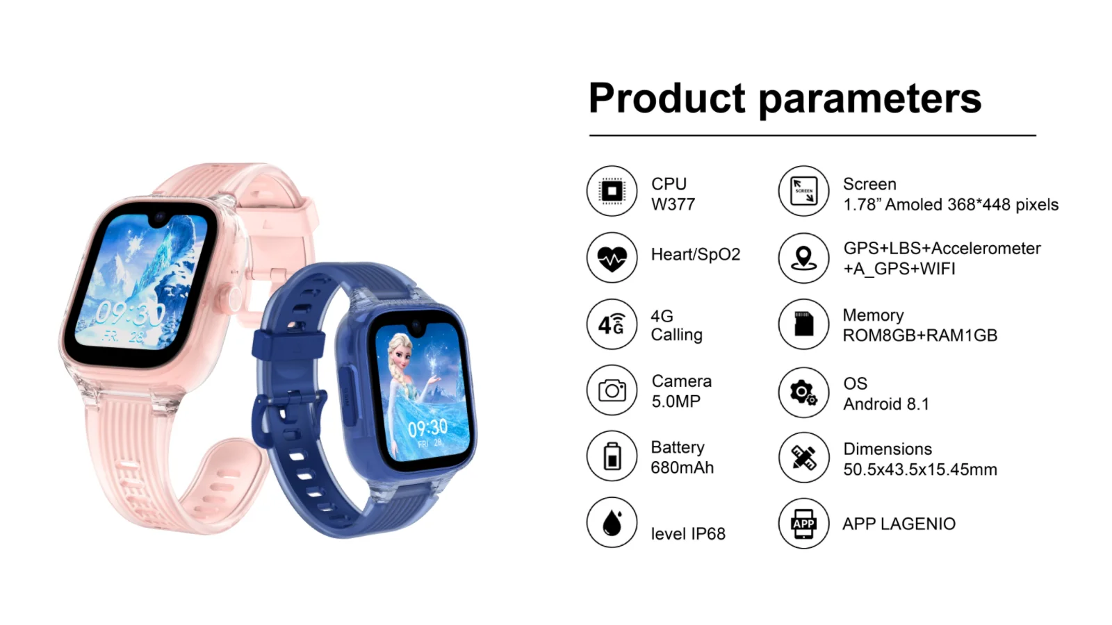 | Jellemzők | Alkalmazás: Lagenio (Google Play/App Store) Videóhívás Üzenetek SOS Gomb Szülői Felügyelet Biztonsági Zóna Beállítás GPS Nyomkövetés Ébresztőóra Lépésszámláló Közösségi média alkalmazások nélkül Egészségügyi Monitorozás |