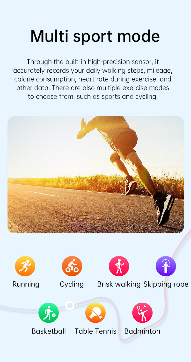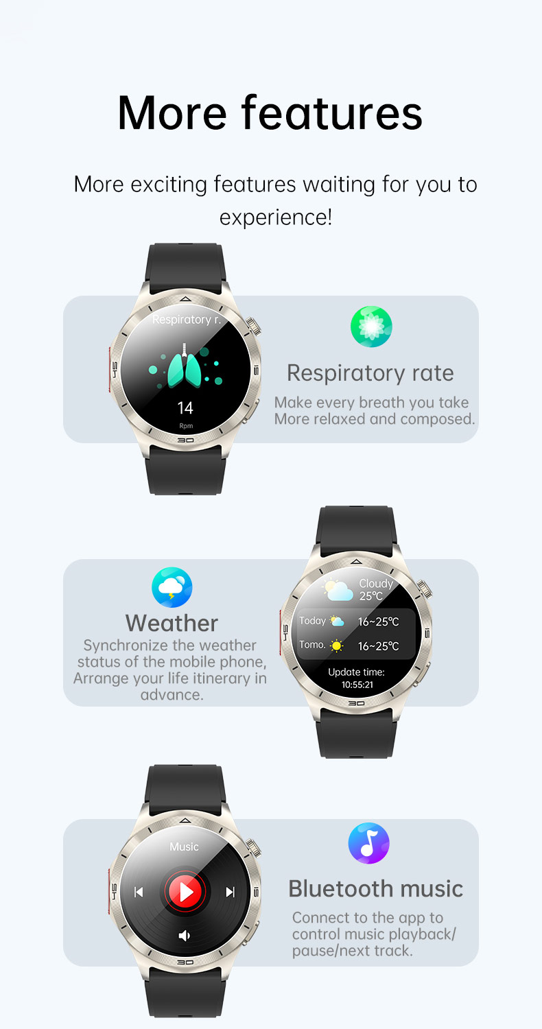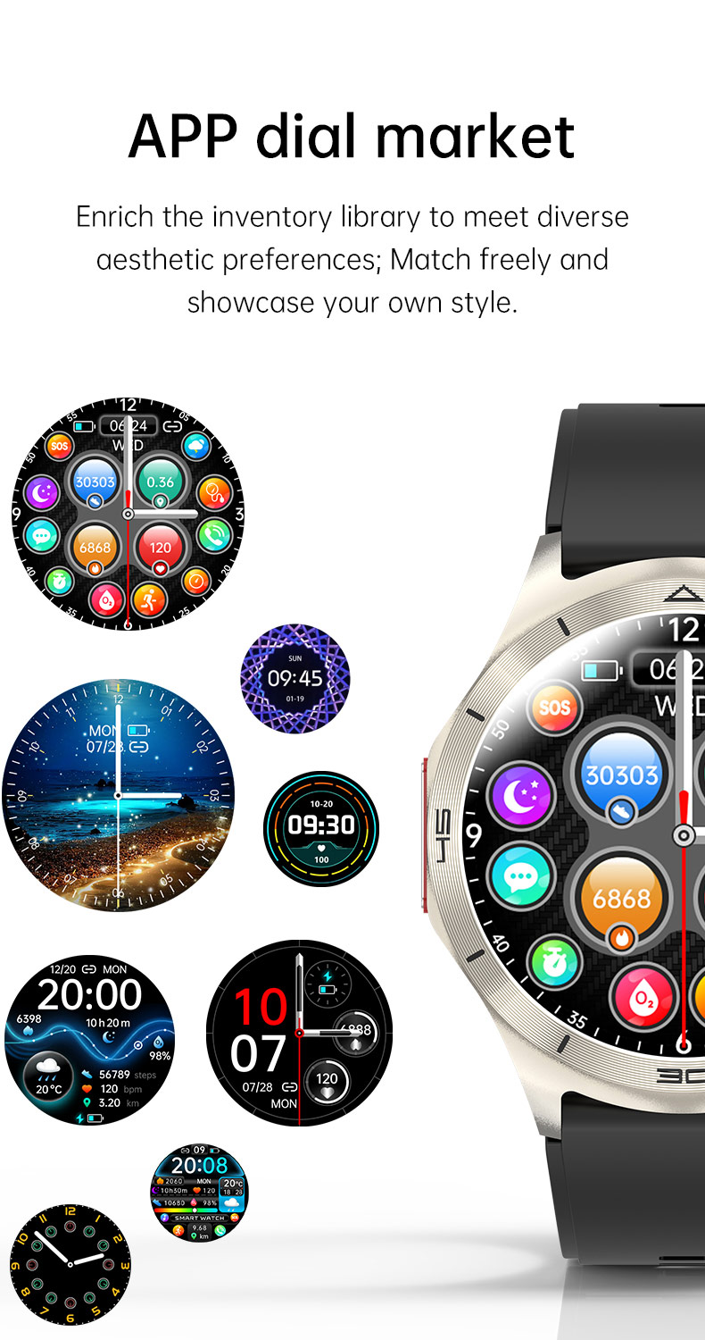 | EKG elektrokardiogram, Bluetooth hívás, Precíz vér oxigén mérés, CES alvás, Fényérzékeny pulzusmérés, Automatikus vérnyomás mérés, Alvás monitorozás, Légzésszám mérés, Pulzus riasztás, Családi és baráti távoli gondoskodás, Több sport mód, Edzés mérés (lépések/kalóriák/távolság), Ülő emlékeztető, Kézfelemelés a képernyő bekapcsolásához, Elvesztés elleni emlékeztető, Üzenet értesítés, Hívás értesítés/elfogadás, Precíz hőmérséklet mérés, Naptár, Hangasszisztens, 7 napos adatkezelés, Távoli kamera vezérlés, Mikro-jel mozgás szinkronizálás, Több órás váltás, Ébresztőóra, Vér lipid, Húgysav | |