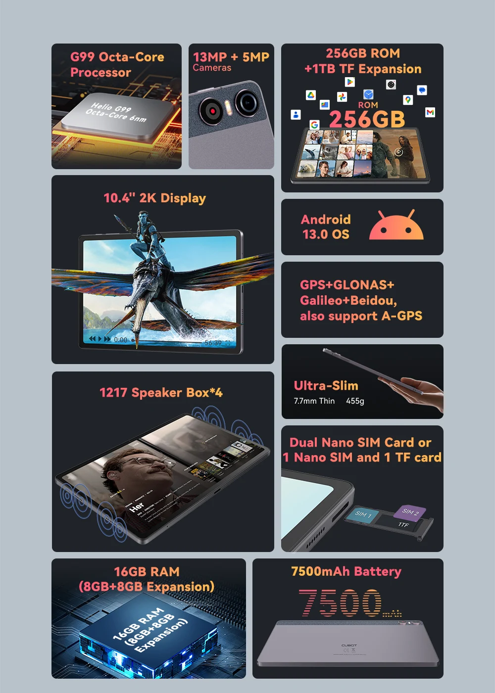 CUBOT Tablet Cubot Tab 50, Szürke, 4G, 10.4" 2K FHD+, 16GB RAM (8GB + 8GB bővíthető), 256GB ROM, 13MP+5MP, Android 13, Helio G99, GPS, OTG, WiFi, 7500mAh, Dual SIM