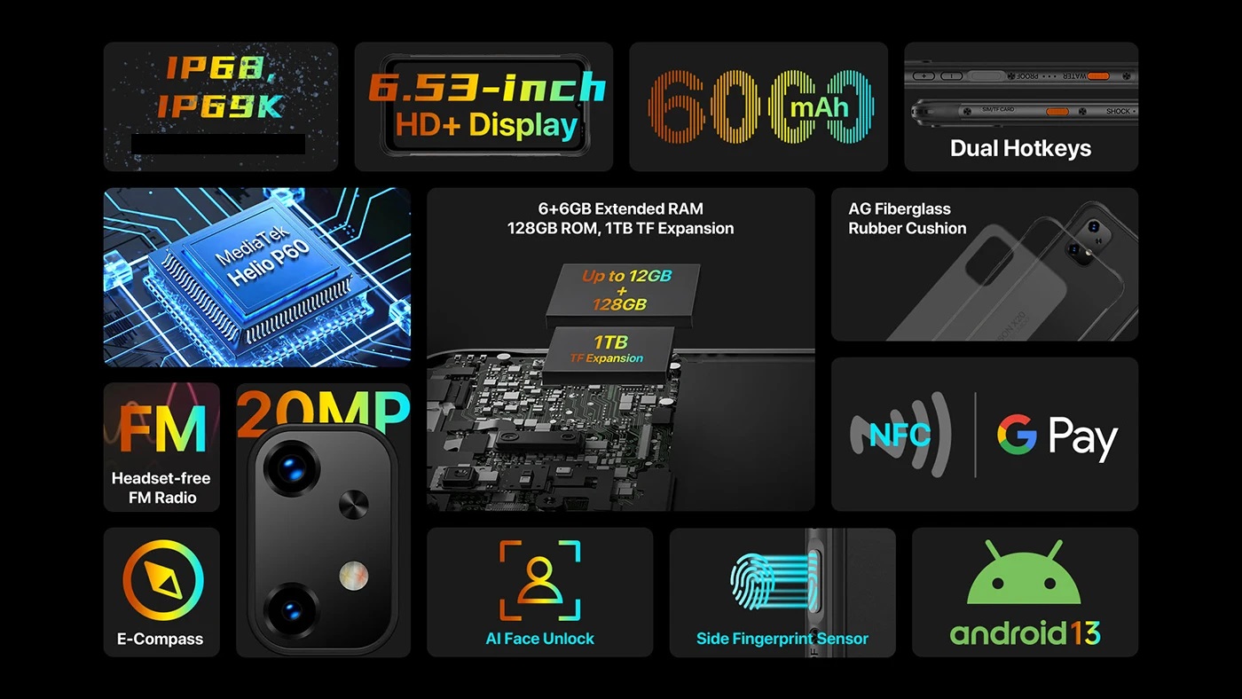 UMIDIGI Bison X20 mobiltelefon, 4G, 6,53" HD+, 12GB RAM (6GB+6GB), 128GB ROM, Android 13, MediaTek Helio P60, 20MP, NFC, Dual SIM, 6000mAh