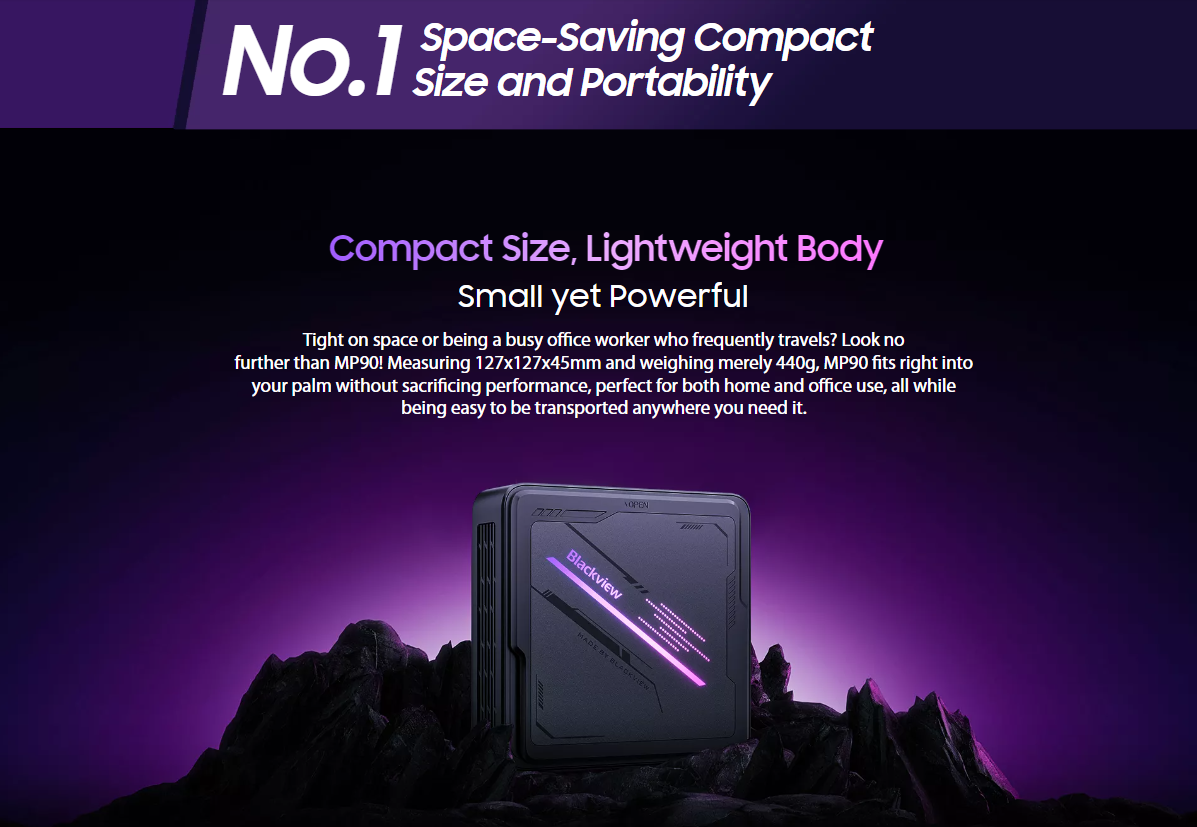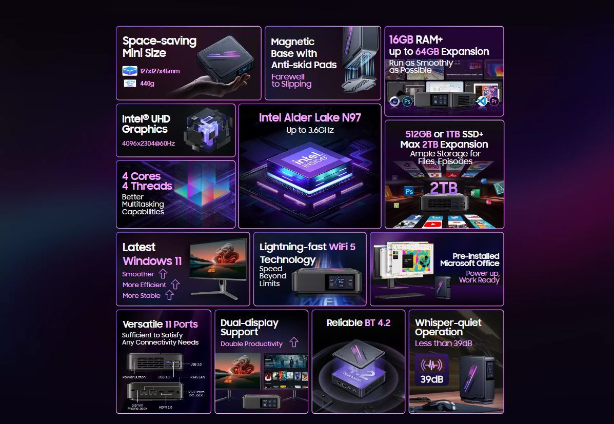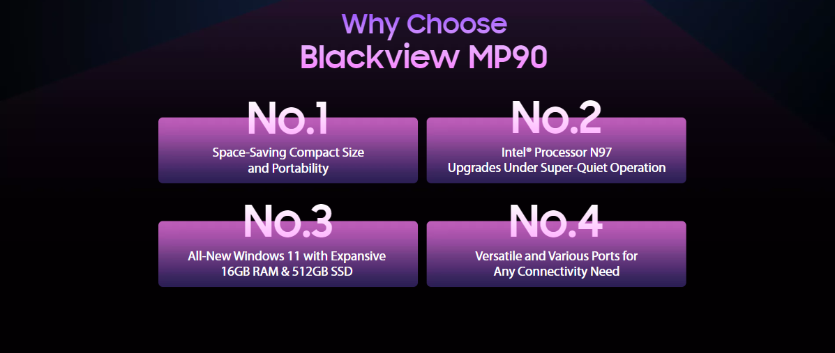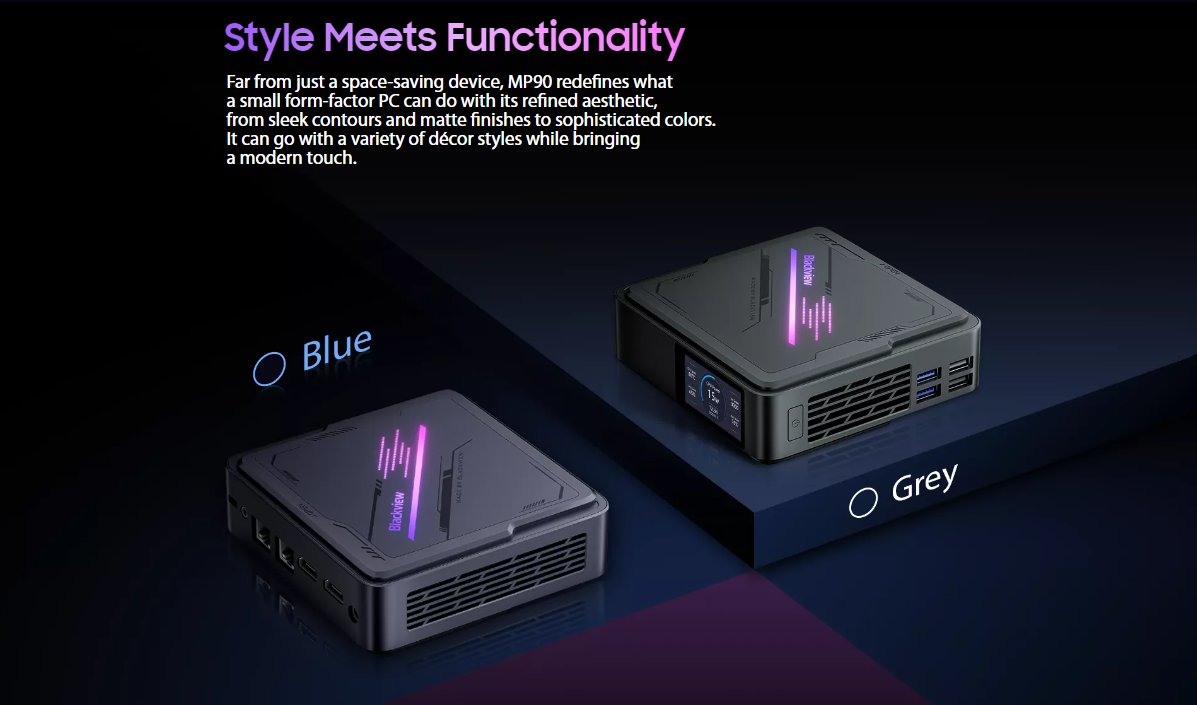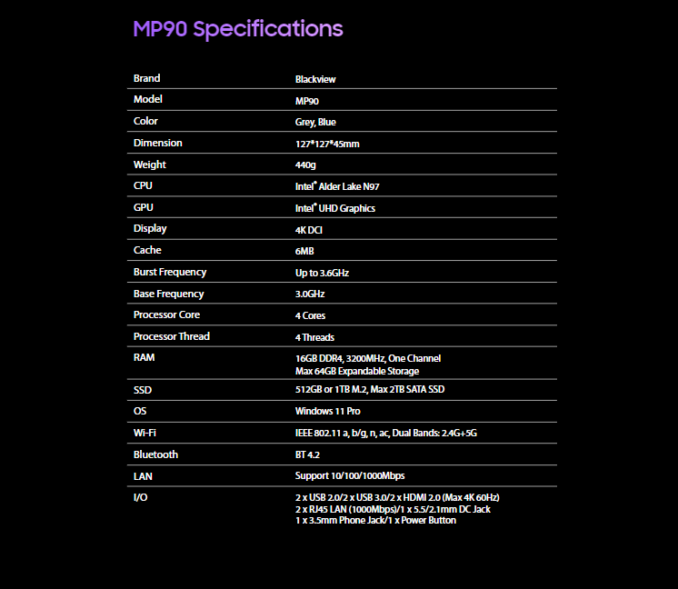 Mini PC Blackview MP90 Gri cu procesor Intel Alder Lake N97, memorie RAM de 16GB și SSD de 1TB. Vine preinstalat cu Windows 11 Pro, oferind performanțe excelente pentru multitasking și gaming, având conectivitate Wi-Fi și Bluetooth.