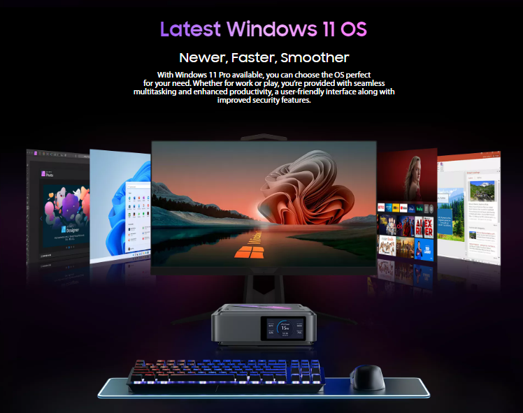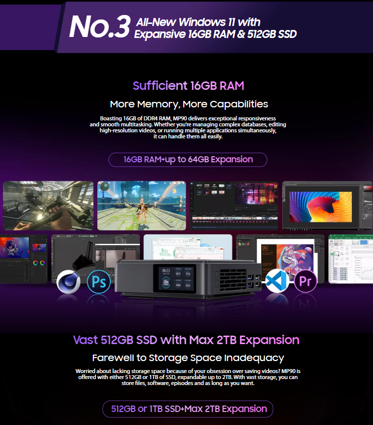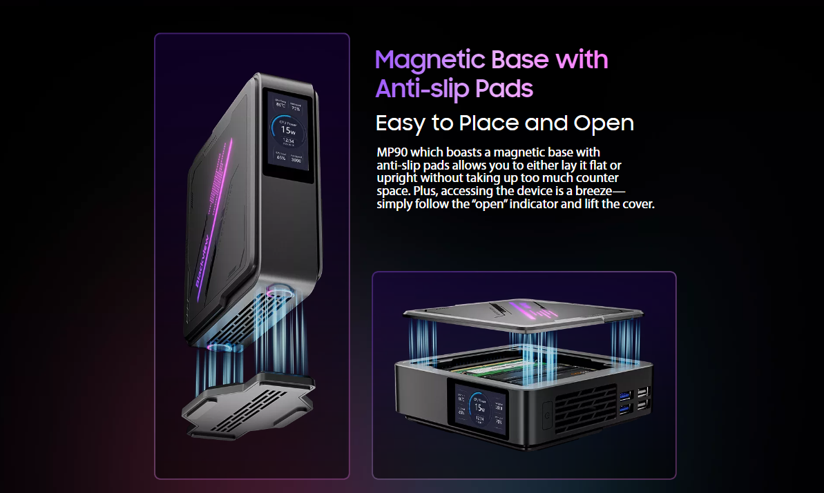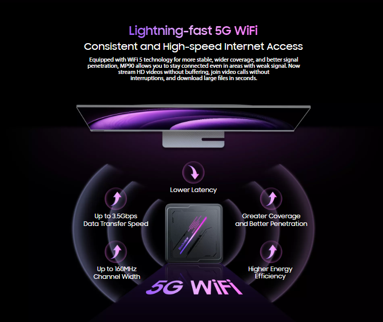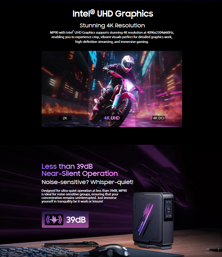 Mini PC Blackview MP90 Gri cu procesor Intel Alder Lake N97, memorie RAM de 16GB și SSD de 1TB. Vine preinstalat cu Windows 11 Pro, oferind performanțe excelente pentru multitasking și gaming, având conectivitate Wi-Fi și Bluetooth.