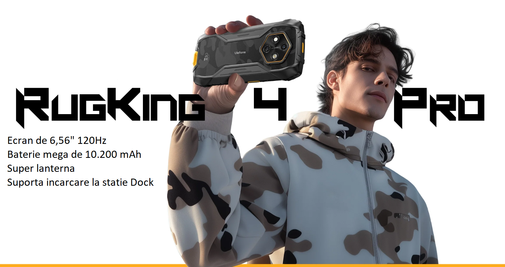 Telefon Mobil Ulefone RugKing 4 Pro, Negru, 4G, 6.56" IPS LCD, 16GB RAM (8GB + 8GB extensibili), 256GB ROM, Android 15, Unisoc T7250, 48MP, Functii AI, 10200mAh, 18W, Dual SIM