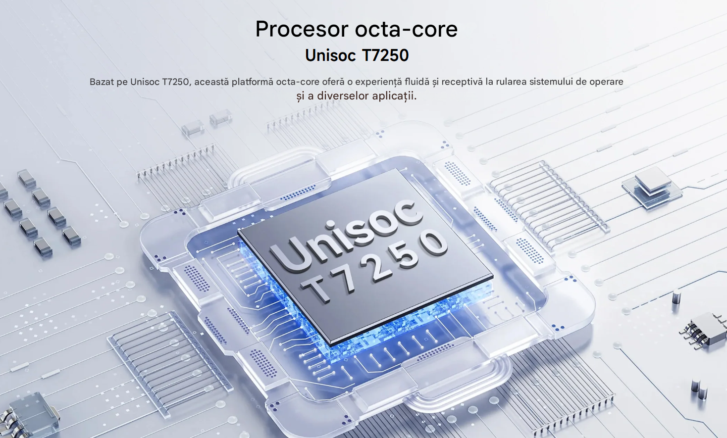 Procesor: Unisoc T7250 Octa-Core (2× A57 1.8GHz + 6× A55 1.6GHz).