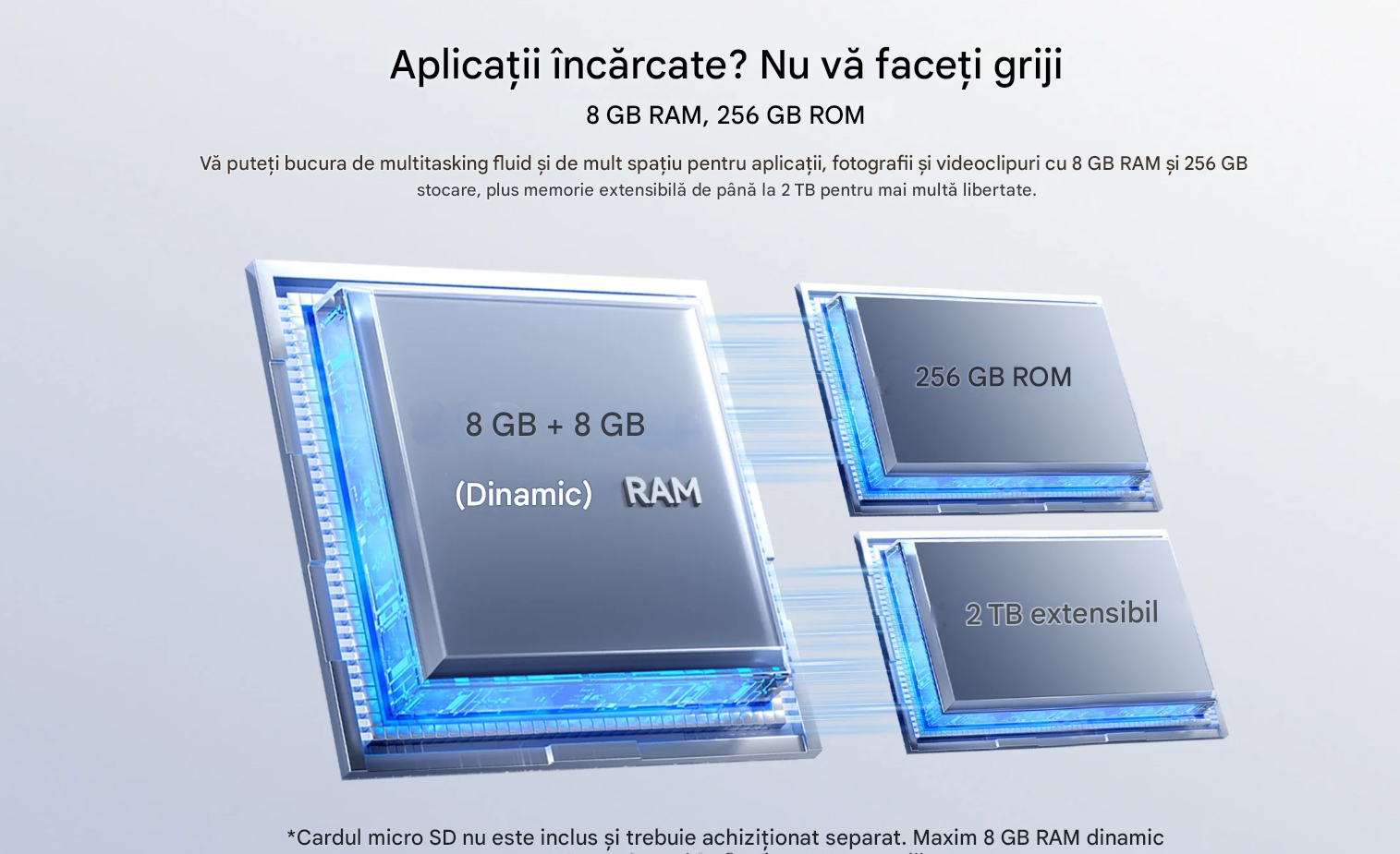 Memorie (RAM/ROM): 8GB LPDDR4X RAM + 256GB ROM UFS2.2 (extensibil cu microSD de până la 2TB).