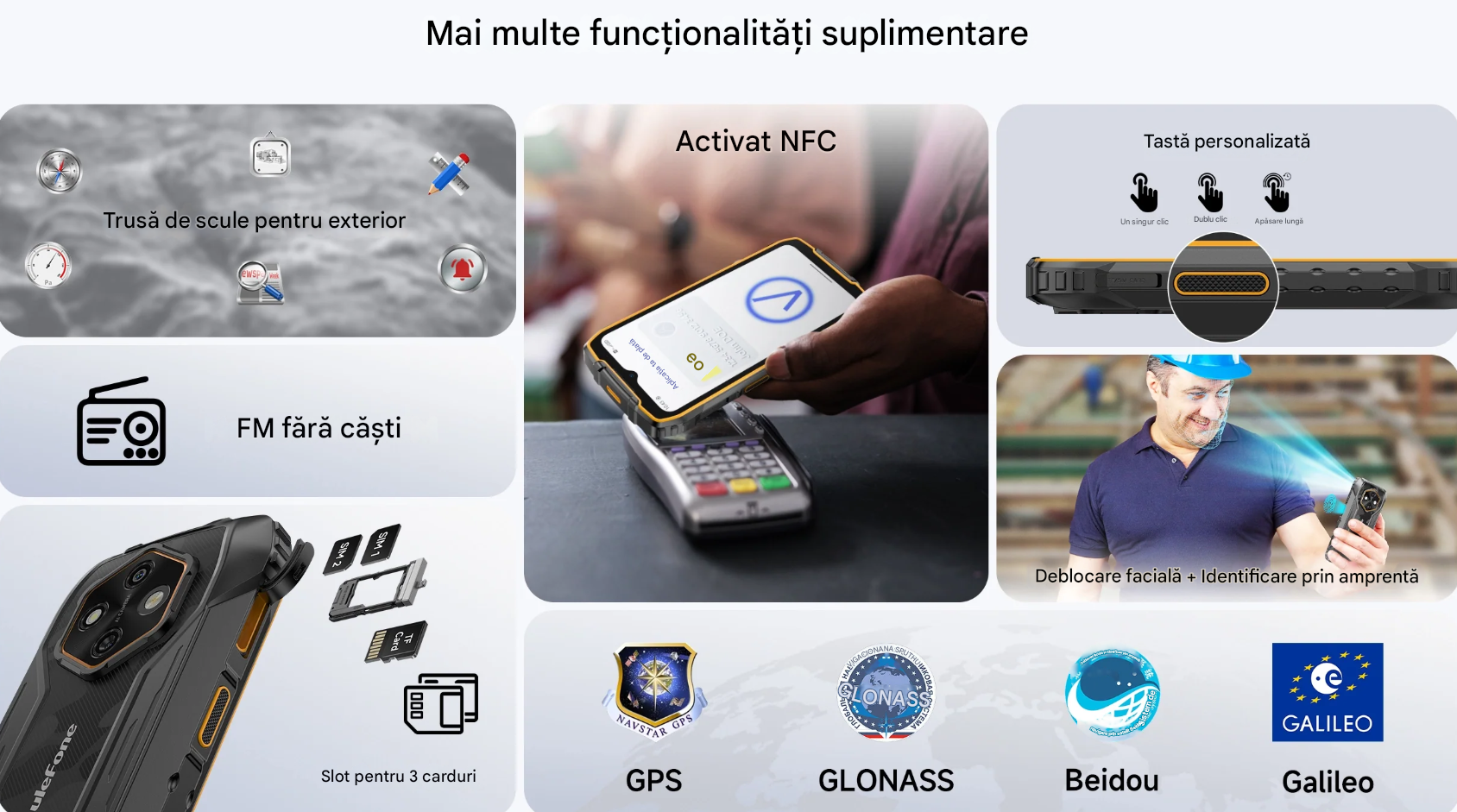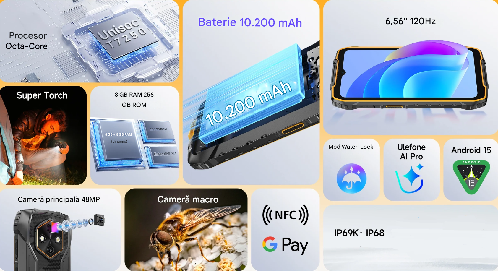 | Altele | Lumina de Notificare: lumina tricolora, suporta notificare incarcare Widevine L1 Toolbox FM Radio Buton customizabil Functii AI: Ulefone AI Pro, Gemini AI, ChatGPT, Grok Lanterna Super Torch |