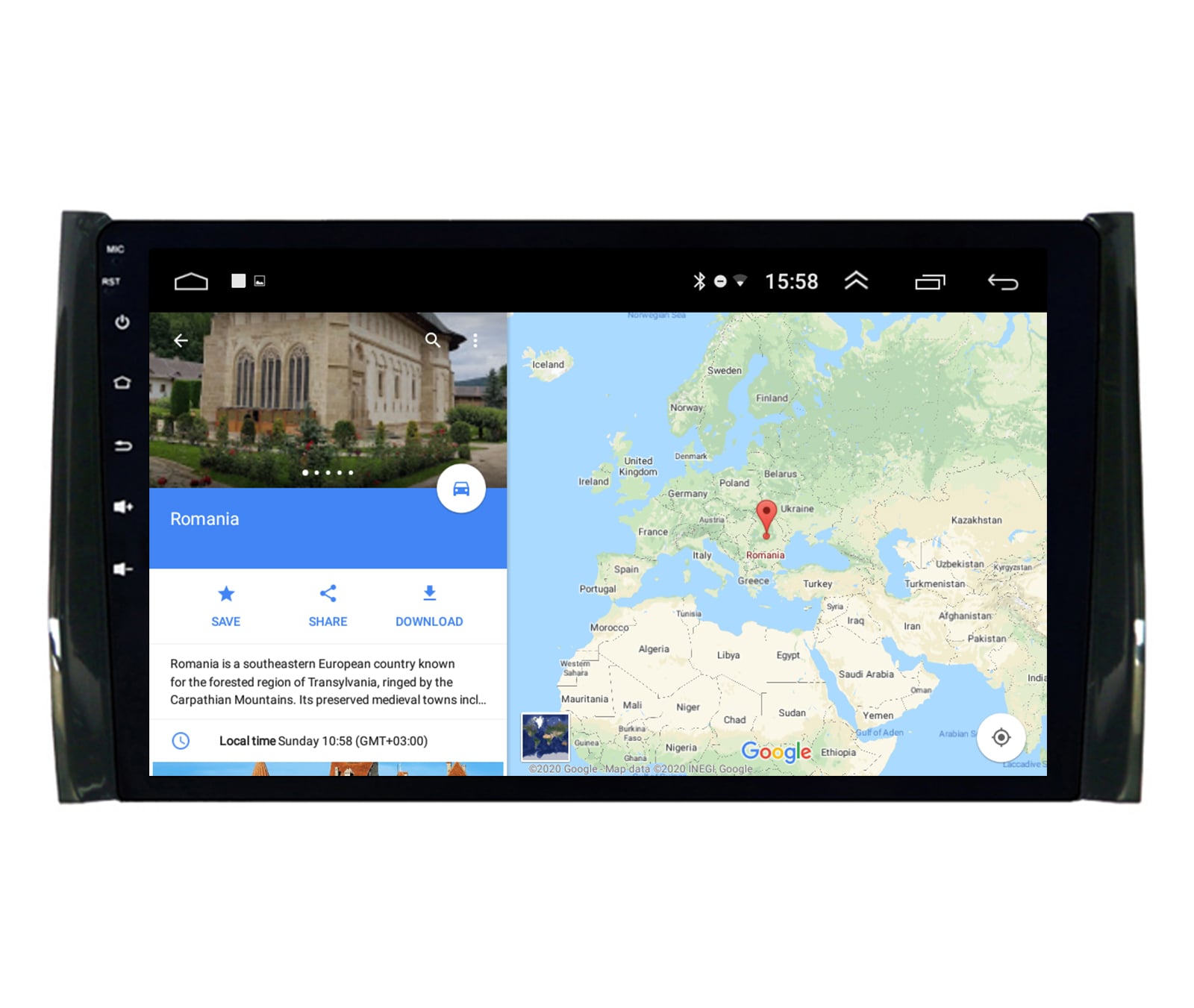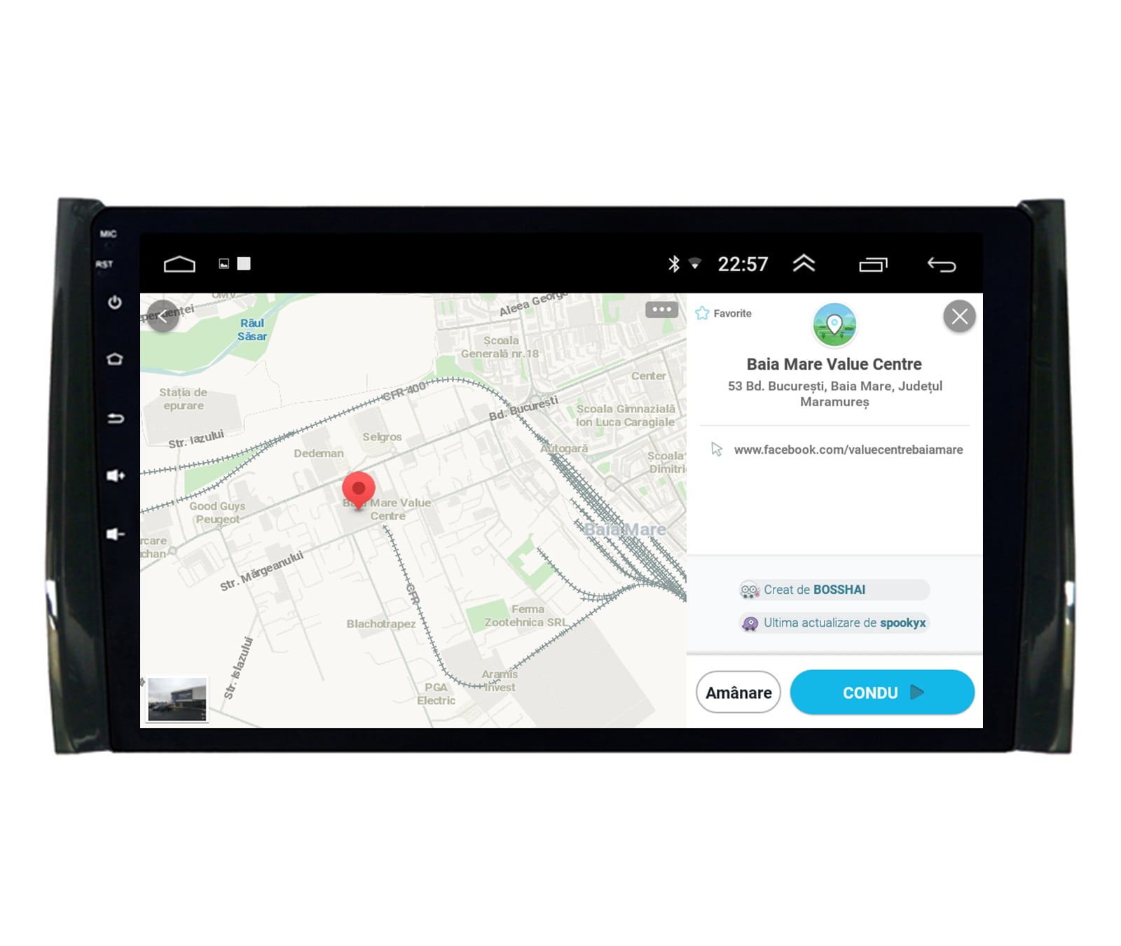 Suport online și offline pentru Navigatia GPS, susține Hărti 3D și îndrumare vocală în diverse limbi disponibile, majoritatea deja setate în limbă romană.