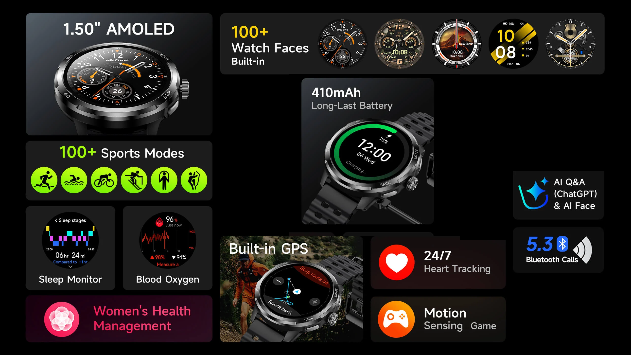 | Monitorizare ritm cardiac 24/7 Monitorizare oxigen in sange (SpO2) Monitorizare somn Women’s Health Management (management sanatate feminina) 100+ moduri sport GPS integrat pentru inregistrarea traseelor AI Q&A (ChatGPT) AI Watch Face |