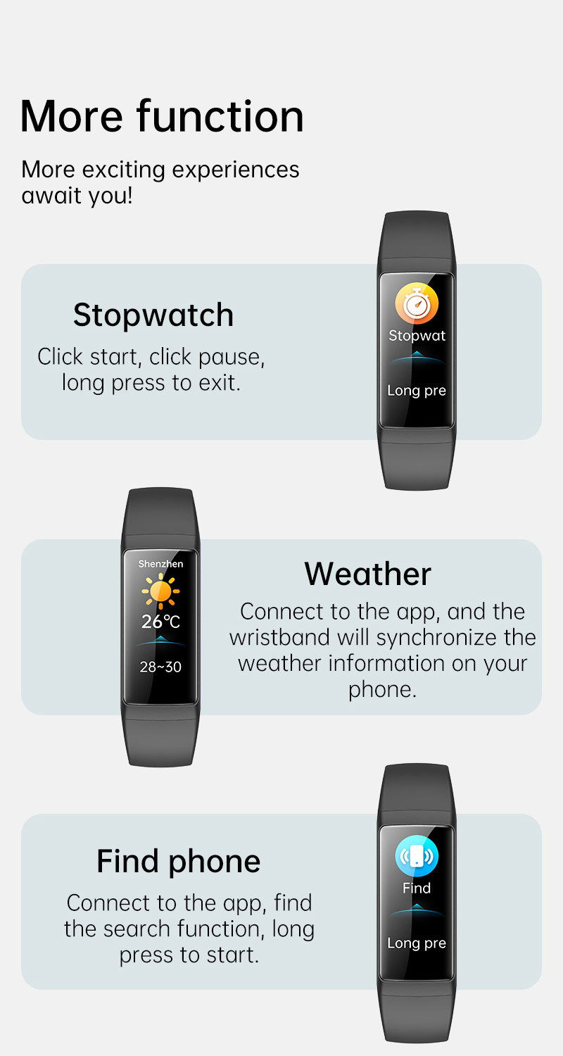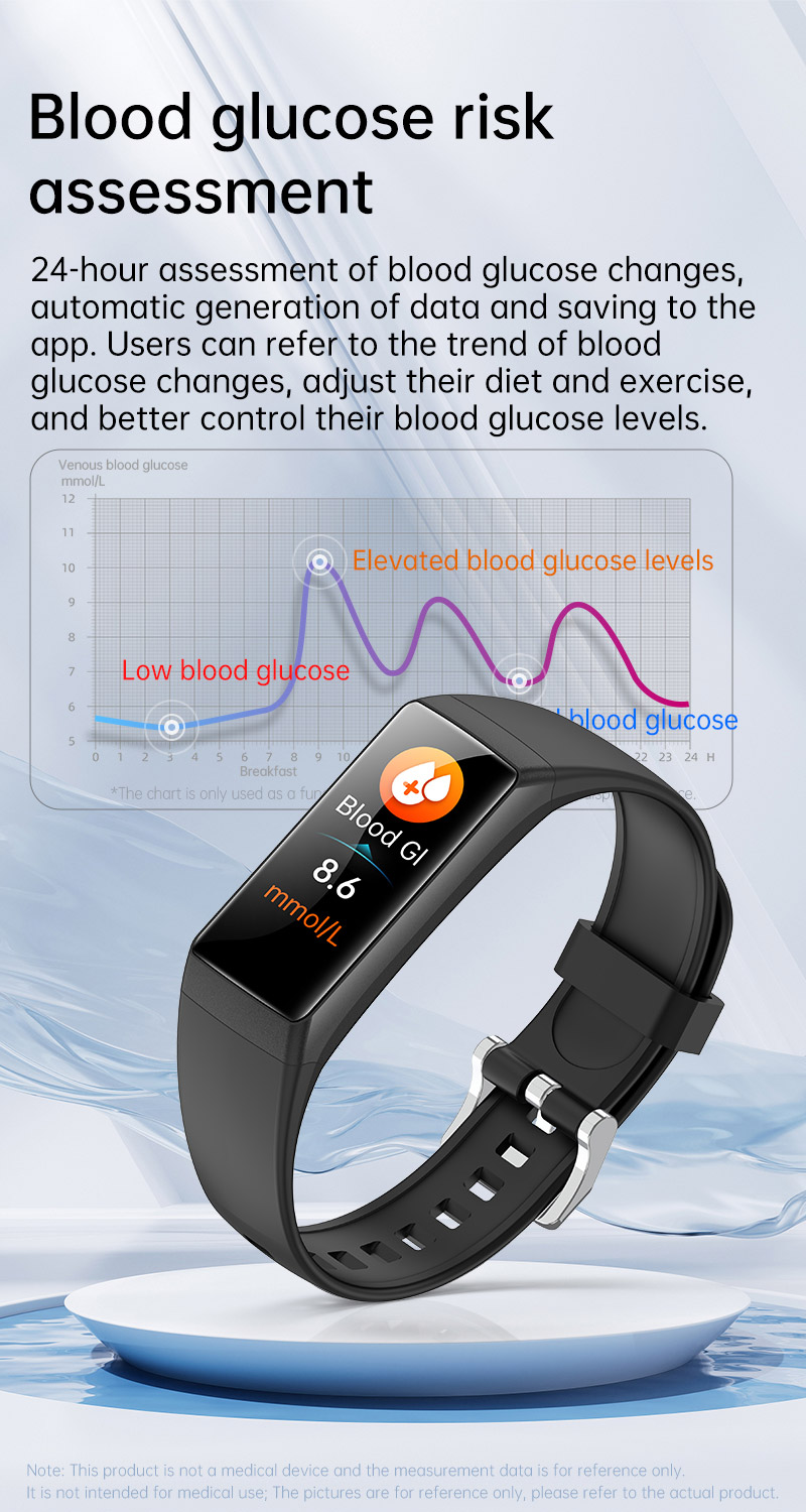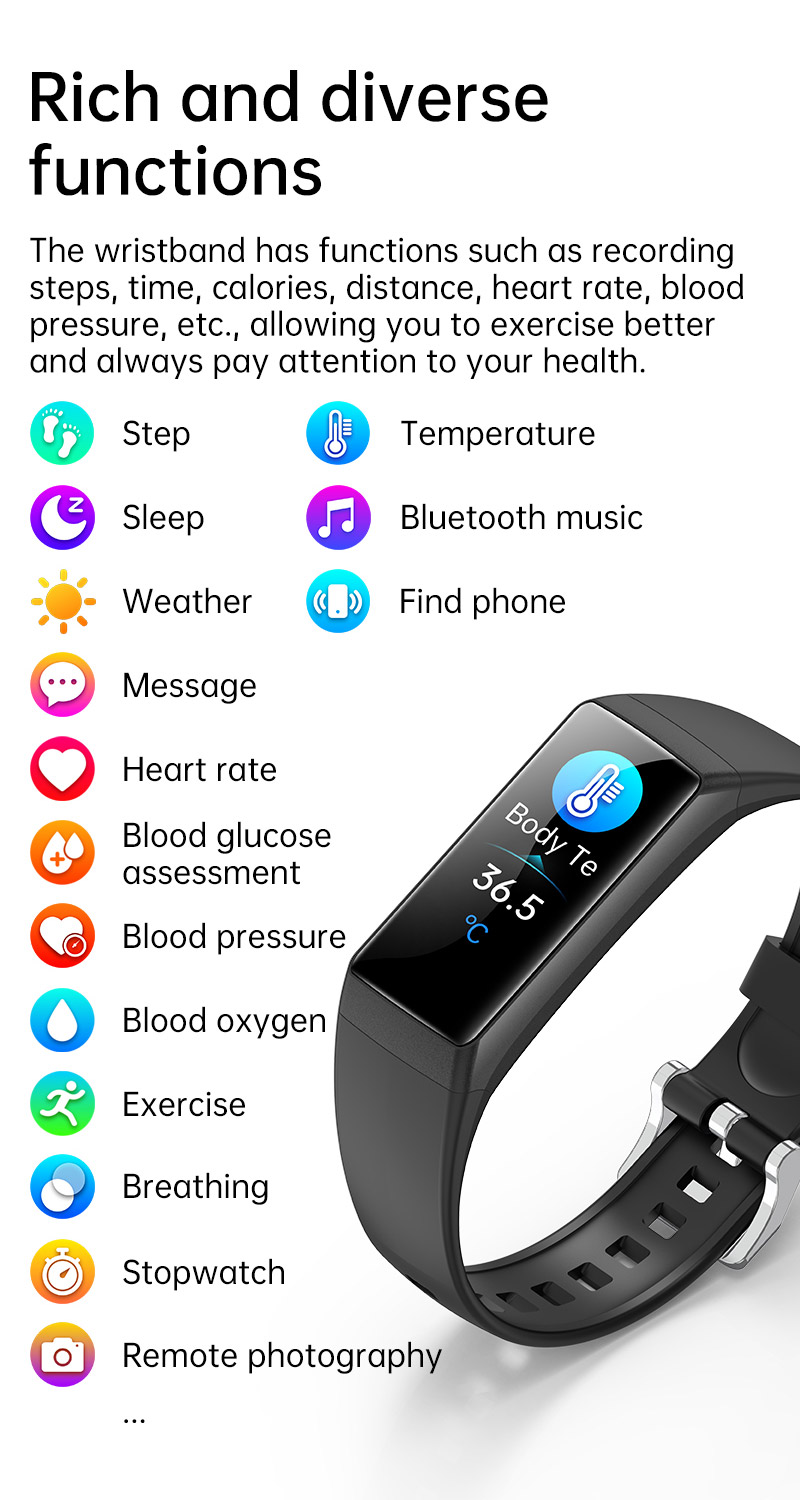Functii: Oximetru, Distanta parcursa, Temperatura corporala, Monitorizare lipide sange, Monitorizare zahar din sange, EKG, Reglare respiratie, Asistare vocala, Apel SOS, Cronometru, Meteo, Multi-Sport, Control muzica, Ritm cardiac, Monitorizare somn, Pedometru, Monitorizare sedentarism, Contor calorii, Presiune sanguina, Monitorizare menstruatie