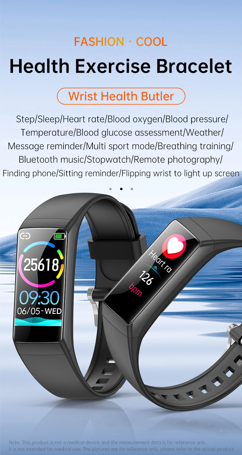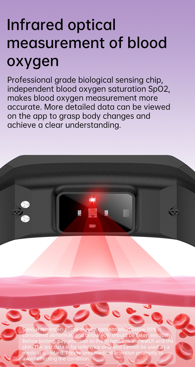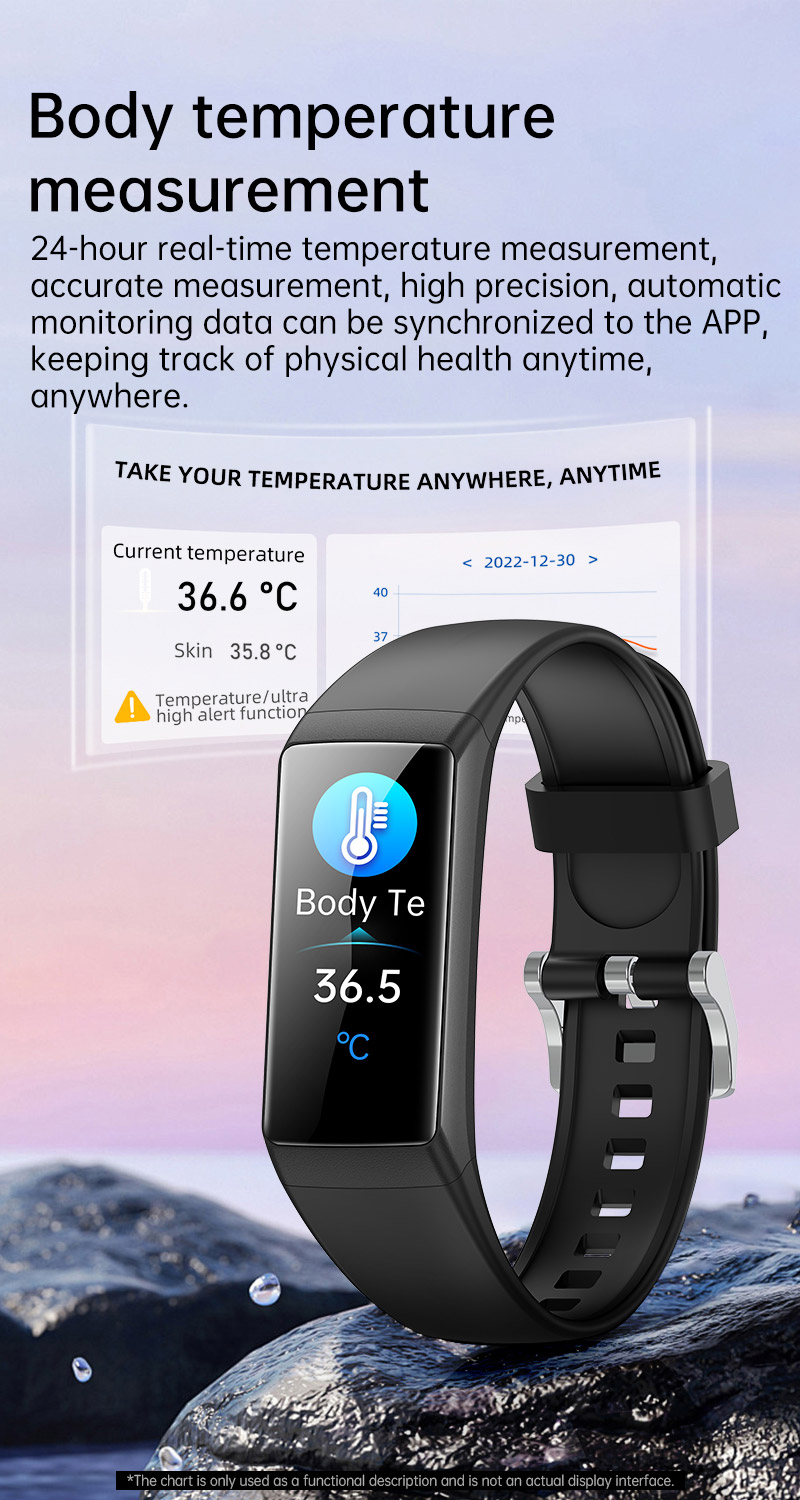 Functii: Oximetru, Distanta parcursa, Temperatura corporala, Monitorizare lipide sange, Monitorizare zahar din sange, EKG, Reglare respiratie, Asistare vocala, Apel SOS, Cronometru, Meteo, Multi-Sport, Control muzica, Ritm cardiac, Monitorizare somn, Pedometru, Monitorizare sedentarism, Contor calorii, Presiune sanguina, Monitorizare menstruatie