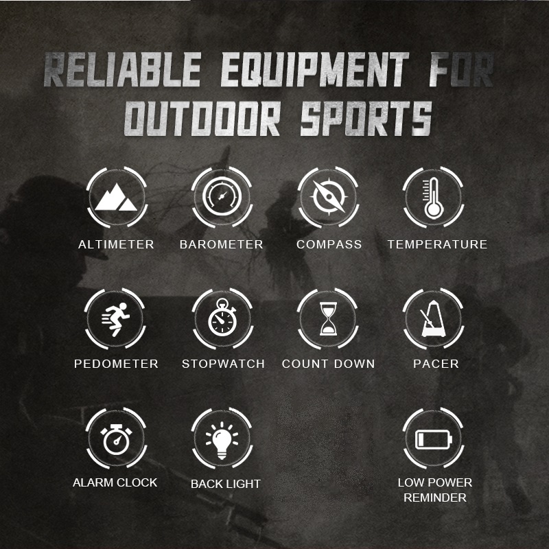 North Edge Apache 46 - Smartwatch robust cu baterie CR2430 si ecran FSTN. Ideal pentru aventuri, avand Altimetru, Barometru si Busola. Carcasa din otel inoxidabil, curea din nylon. Functii: Pasi, Cronometru, Alarma. Un ceas durabil pentru explorare.