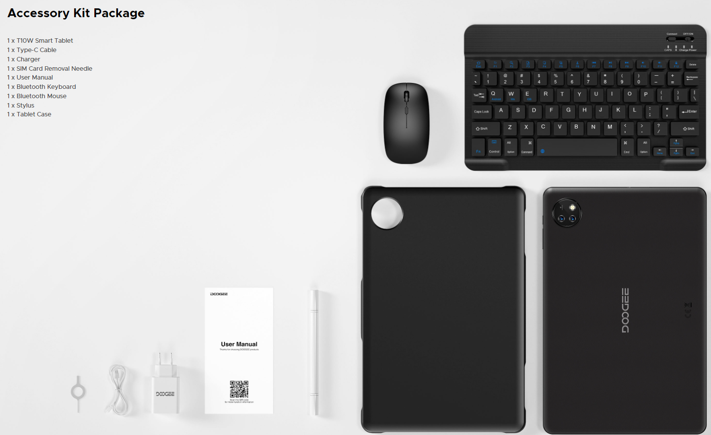 | Accesorii incluse | 1 x Tabletă Doogee T10W 1 x Cablu Type C 1 x Încărcător 10W 1 x Cheiță pentru SIM 1 x Tastatură Bluetooth 1 x Mouse Bluetooth 1 x Stylus 1 x Husă pentru tabletă |