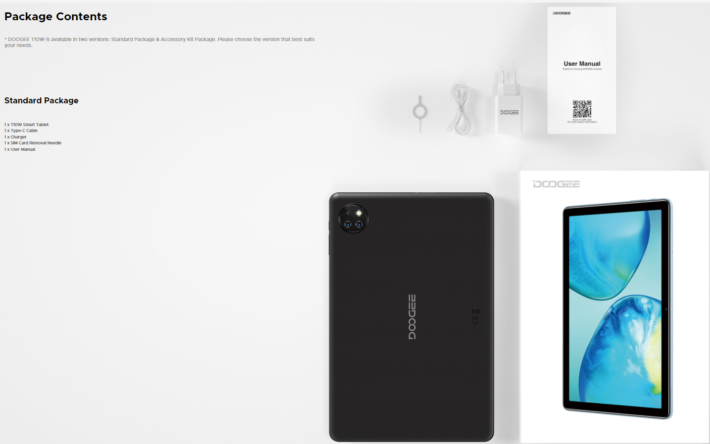 | 1x Tableta Doogee T10W 1x Cablu USB TypeC 1x Incarcator 10W 1x Cheita SIM |