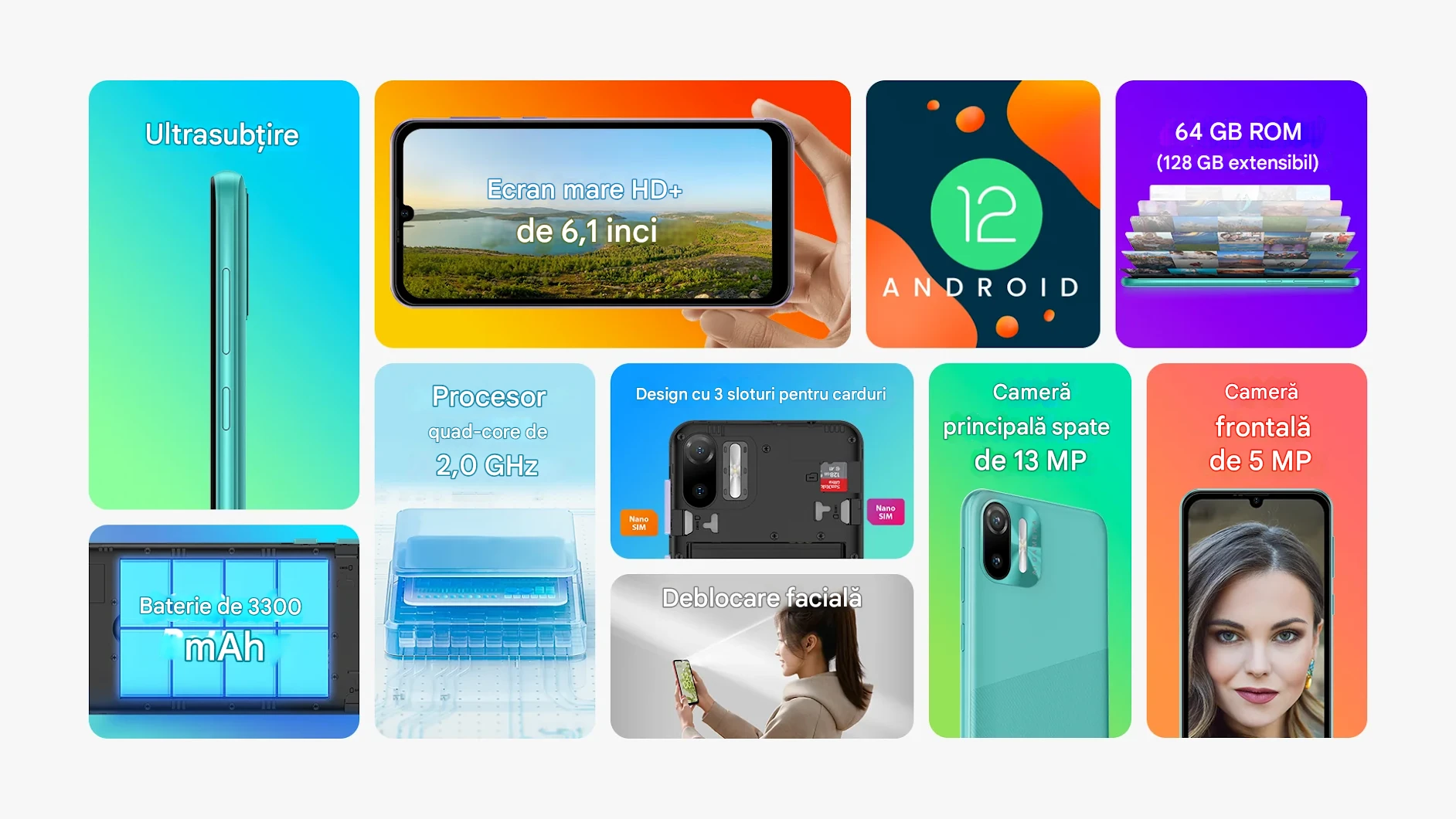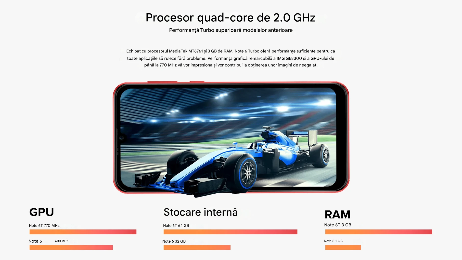 | Microprocesor | Mediatek MT6761 Helio A22 (12 nm), Quad‑core 4x 2.0 GHz Cortex‑A53 |