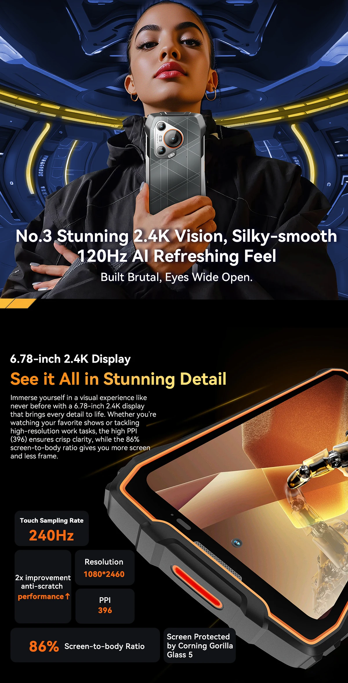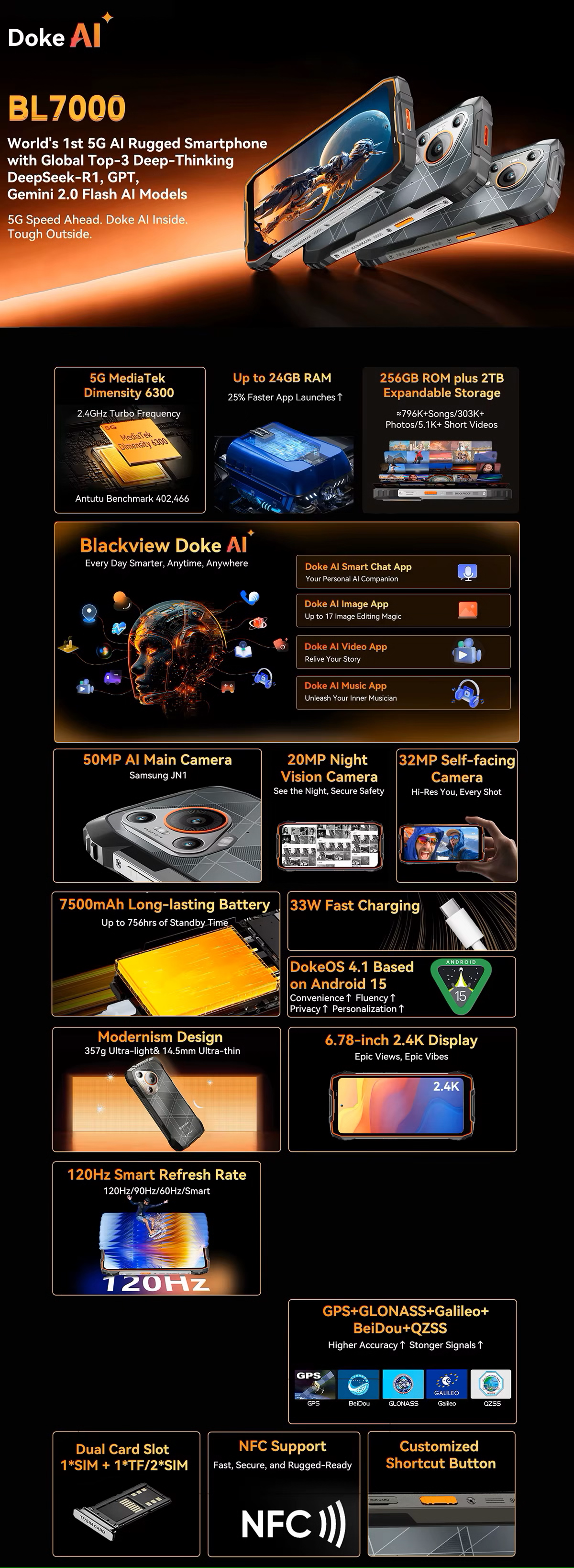 Blackview Telefon mobil Blackview BL7000 Portocaliu, 5G, 6.78" IPS HD+ 2.4K 120Hz, 24GB RAM (8GB+16GB extensibili), 256GB ROM, Android 15, 50MP, NightVision, NFC, WiFi 6, 7500mAh, 33W, OTG, DokeAI, Dual SIM