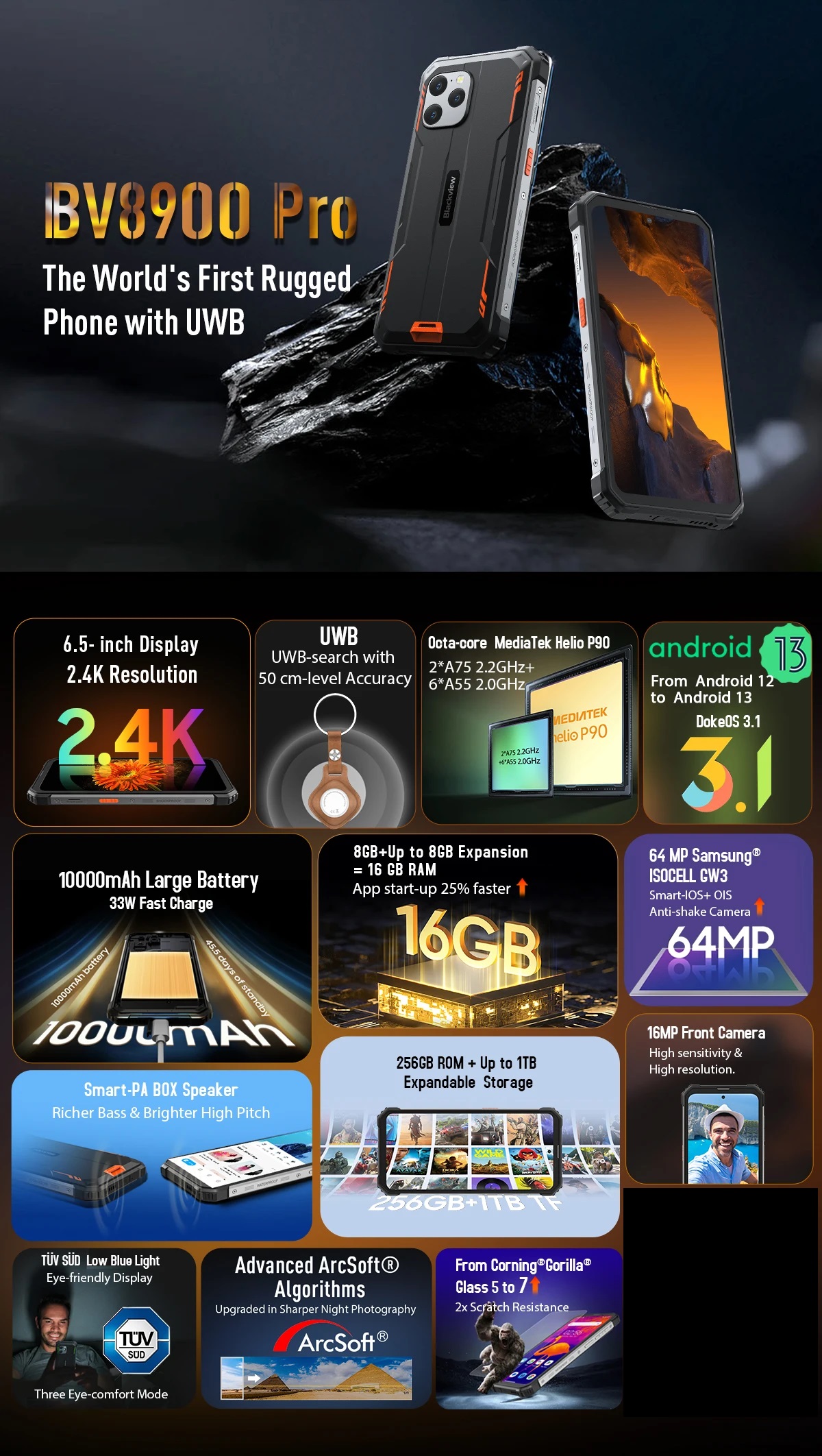 Telefon mobil Blackview BV8900 Pro Negru, 4G, 6.5'' FHD 2.4K, 64MP, 16GB RAM (8GB + 8GB extensibili), 256GB ROM, Android 13, Helio P90, Localizare UWB, 10000mAh, NFC, Dual SIM