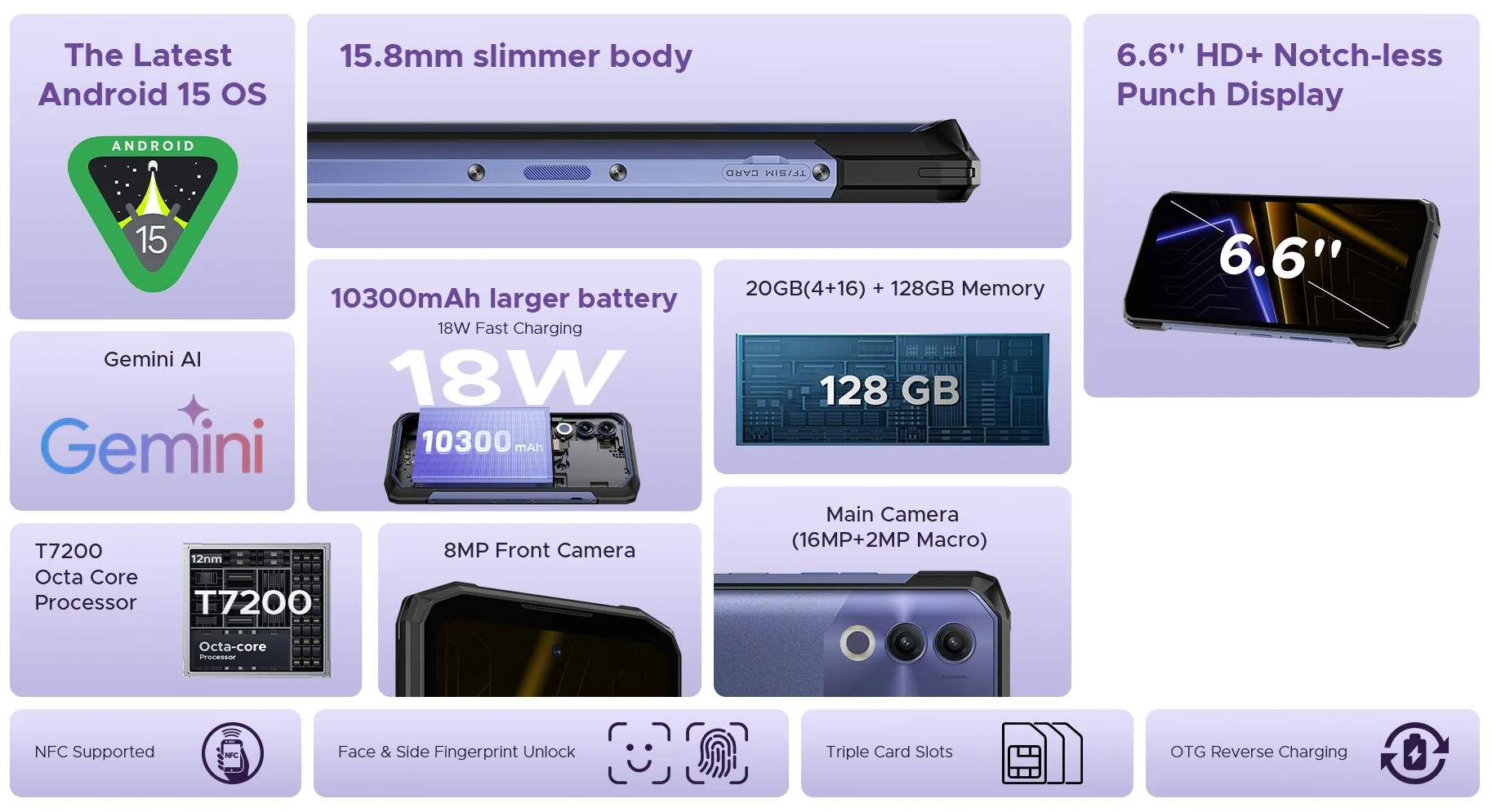 Doogee Blade 20 gri este un smartphone 4G cu ecran mare de 6.6", baterie de 10300mAh si Android 15. Cu 20GB RAM si 128GB stocare, camera duala 16MP+8MP si NFC, este ideal pentru utilizare zilnica, oferind performanta si autonomie excelente.