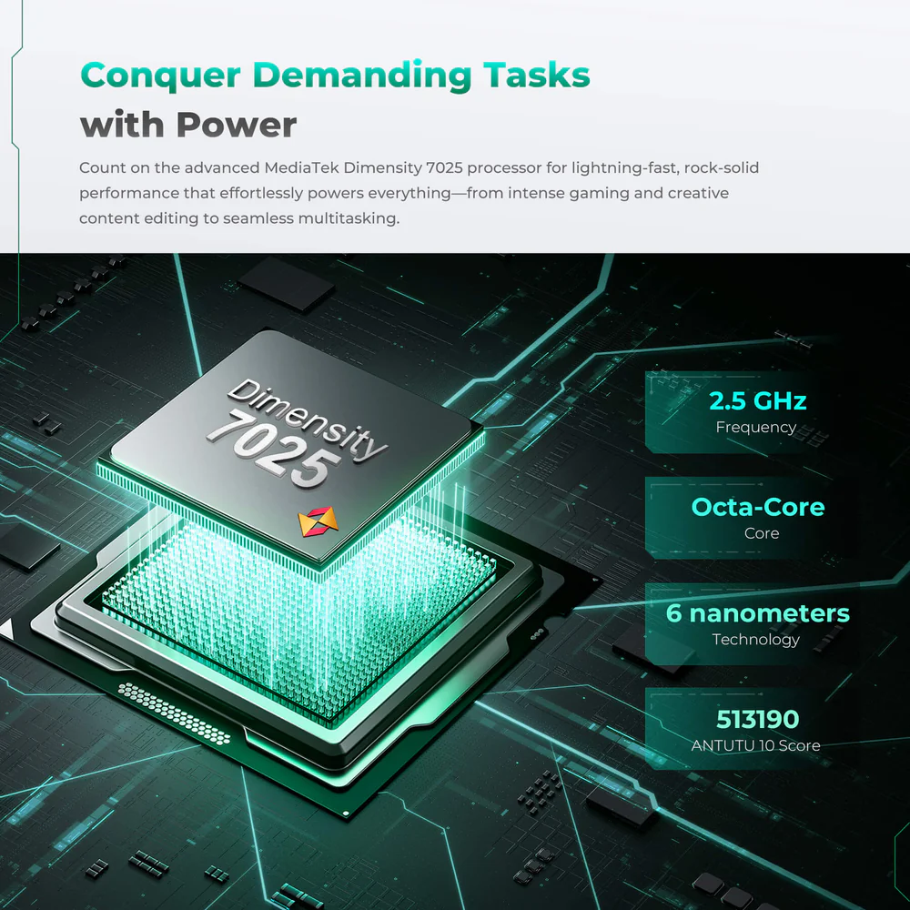 Procesor Puternic: MTK Dimensity 7025 Octa-core 2.5 GHz (6nm) – Viteză și eficiență superioare.