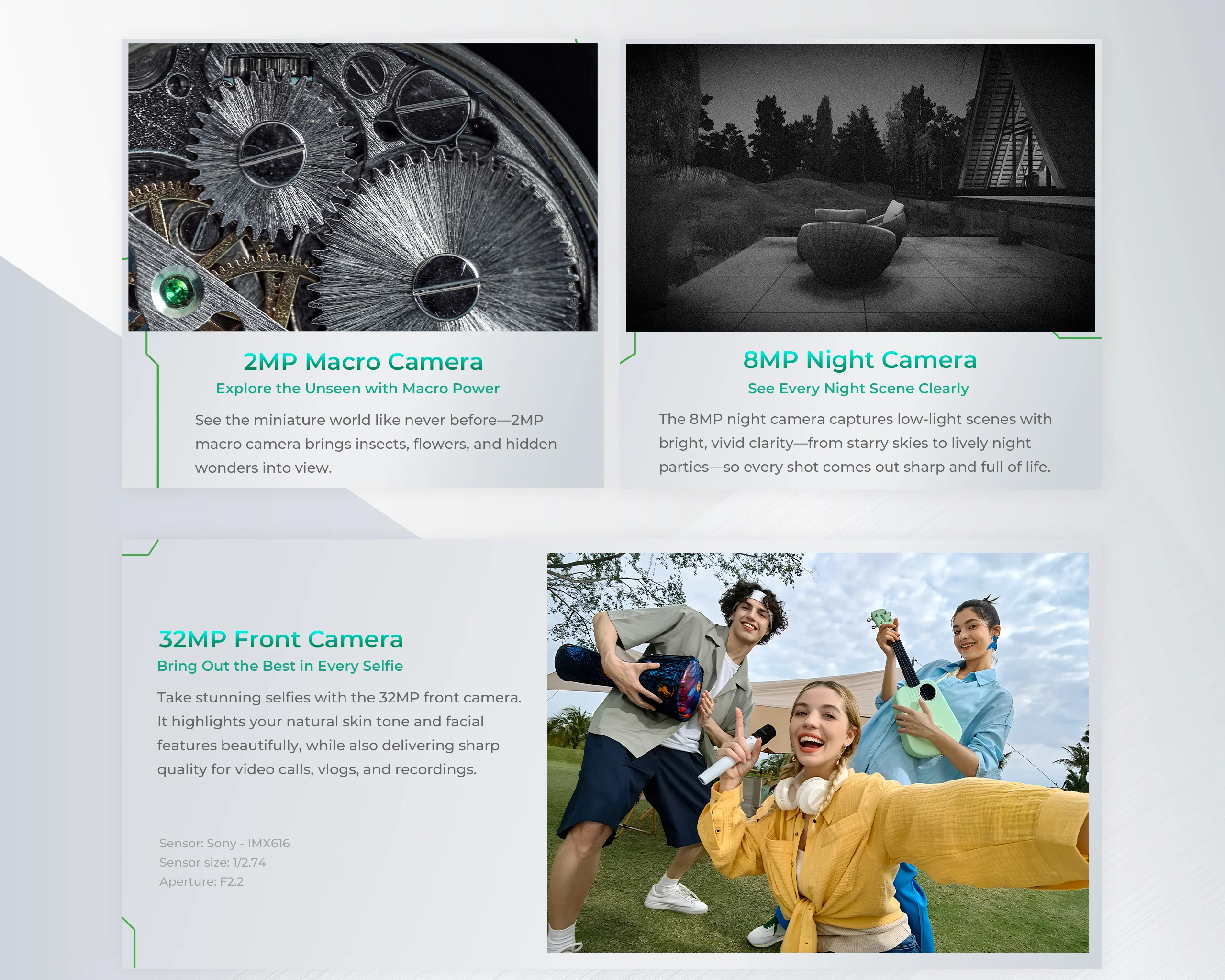 Funcții Speciale Cameră: Night Vision (8MP) și Macro (2MP).