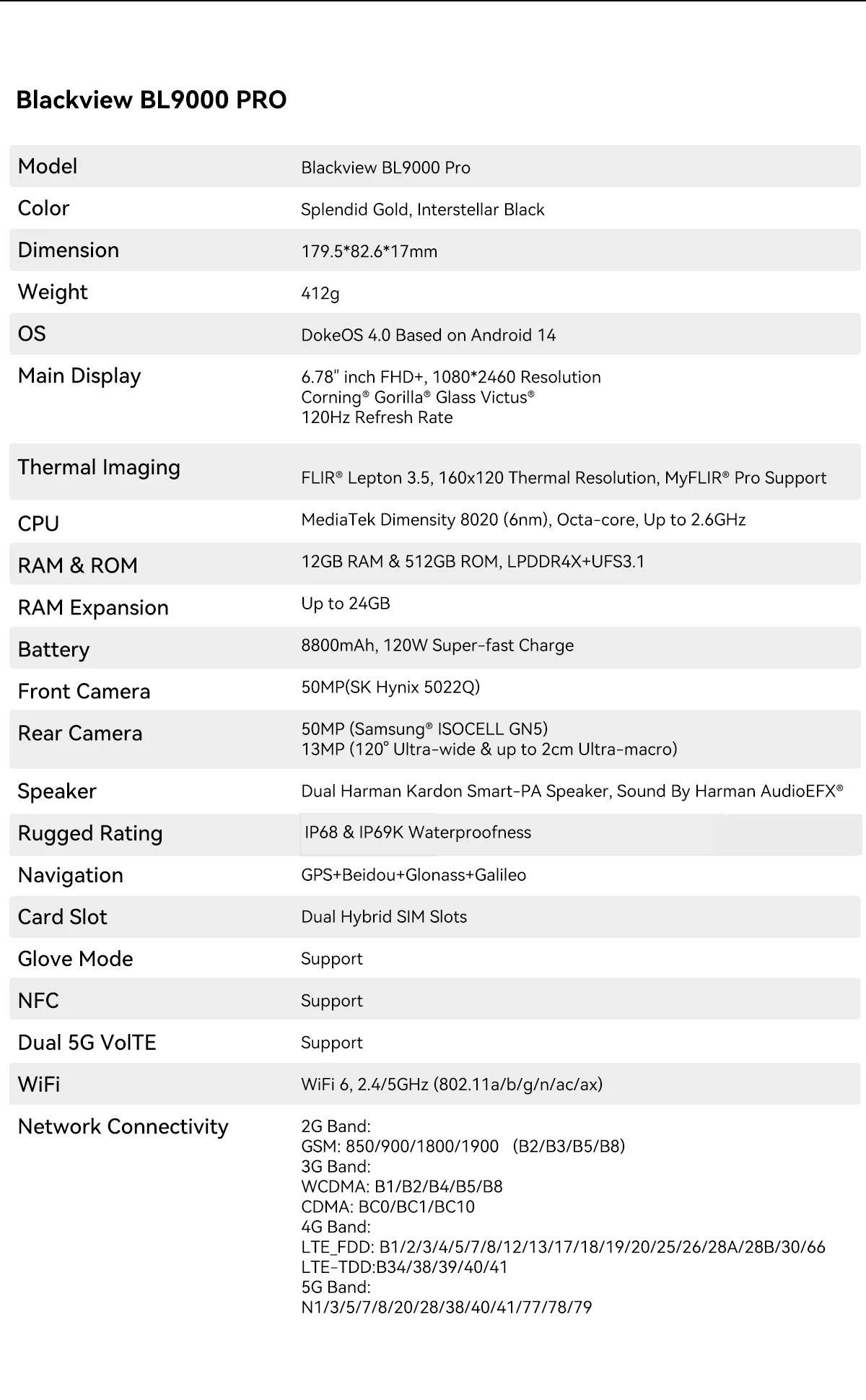 Telefon mobil Blackview BL9000 Pro Black,5G, Camera termica FLIR® Lepton 3.5, 6.78" 2.4K FHD+ 120Hz, 36GB RAM(12GB + 24GB extensibili), 512GB ROM, Android 14, 8800mAh,MediaTek Dimensity 8020, Dual SIM