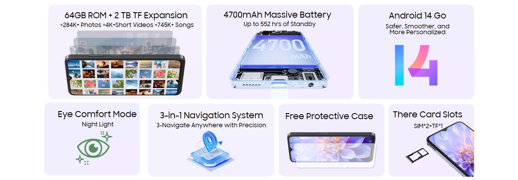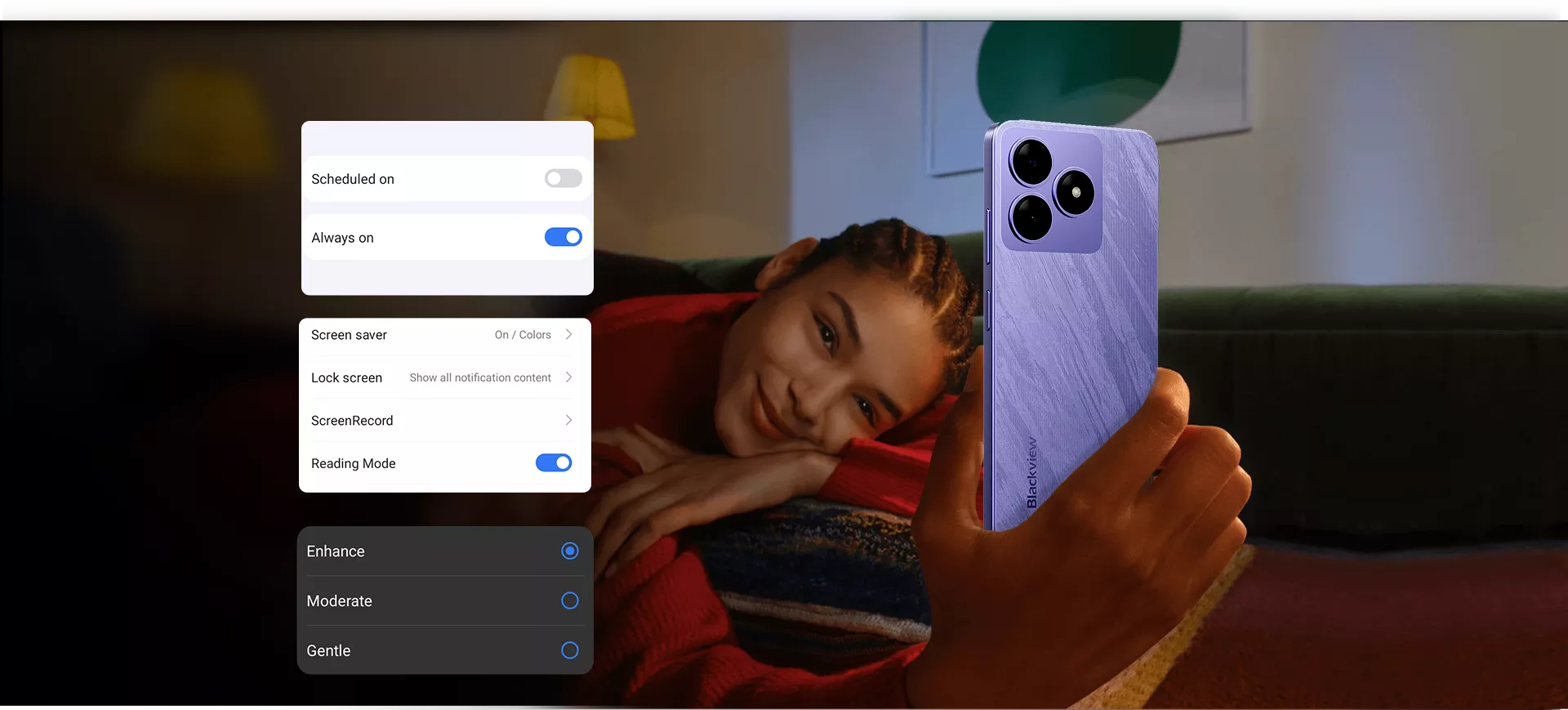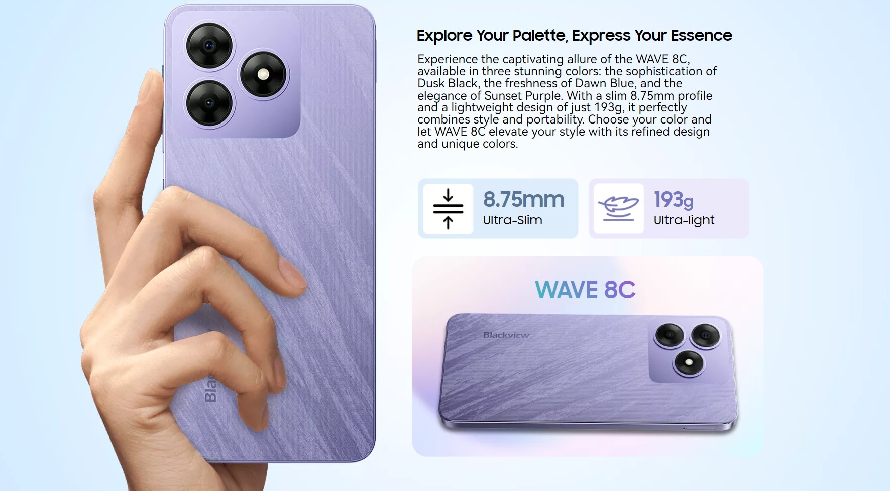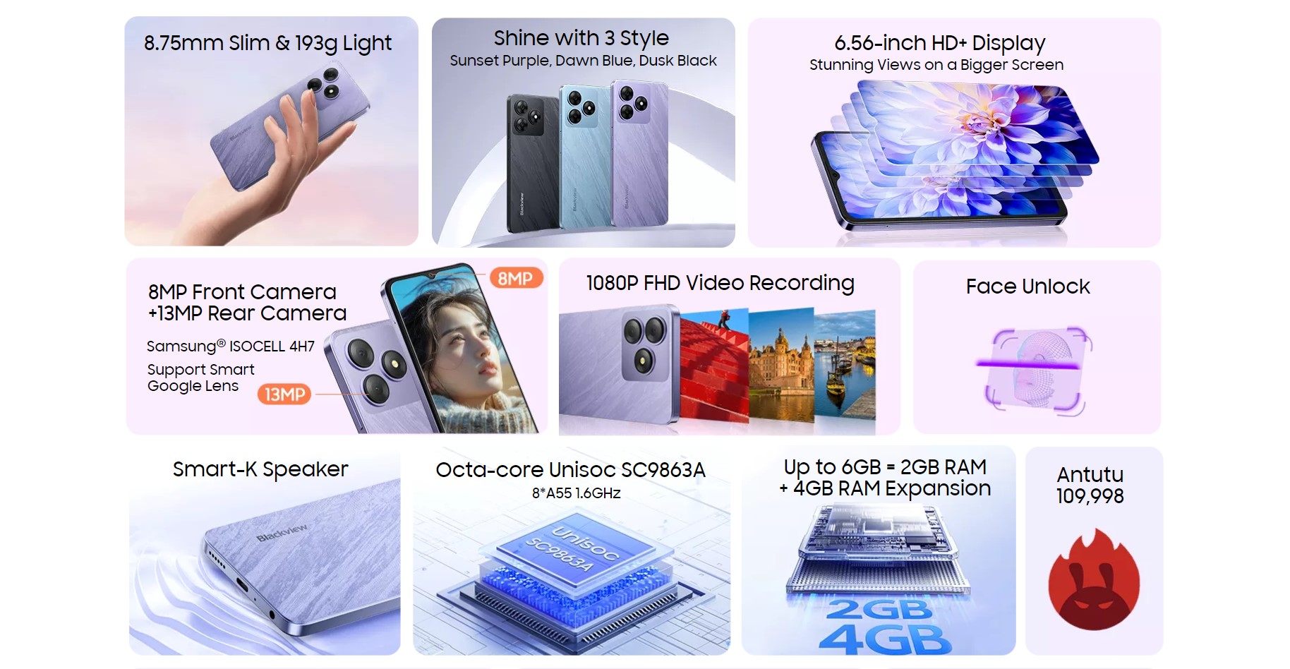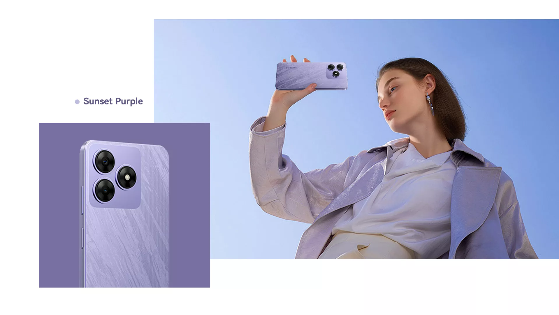 Telefon mobil Blackview Oscal Wave 8C Mov, cu display HD+ de 6.56", 6GB RAM extensibili, 64GB memorie internă, cameră 13MP, Android 14 GO, procesor Unisoc SC9863A și baterie 4700mAh. Dual SIM și suport 4G.