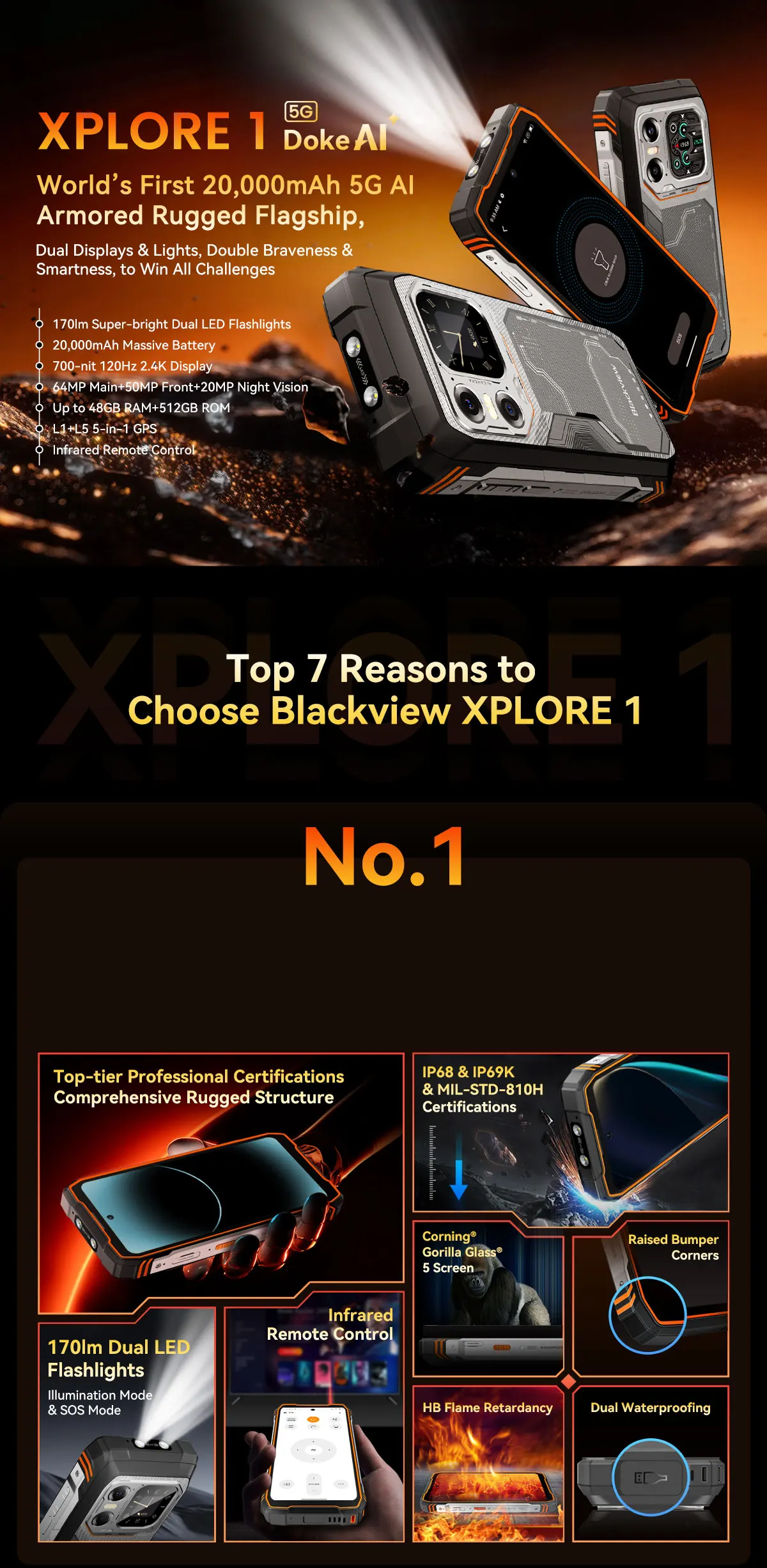 Blackview Xplore 1 de culoare Negru, ofera display FHD+ IPS de 6.78″ cu rata de refresh de 120 Hz si ecran secundar de 2.01″ IPS pentru notificari. Dotat cu 16 GB RAM si 512 GB ROM extensibili, camera principala full HD 64 MP + 20 MP night vision, frontala 50 MP Samsung, baterie 20000 mAh, incarcare rapida 55 W, NFC si IP68/IP69K.