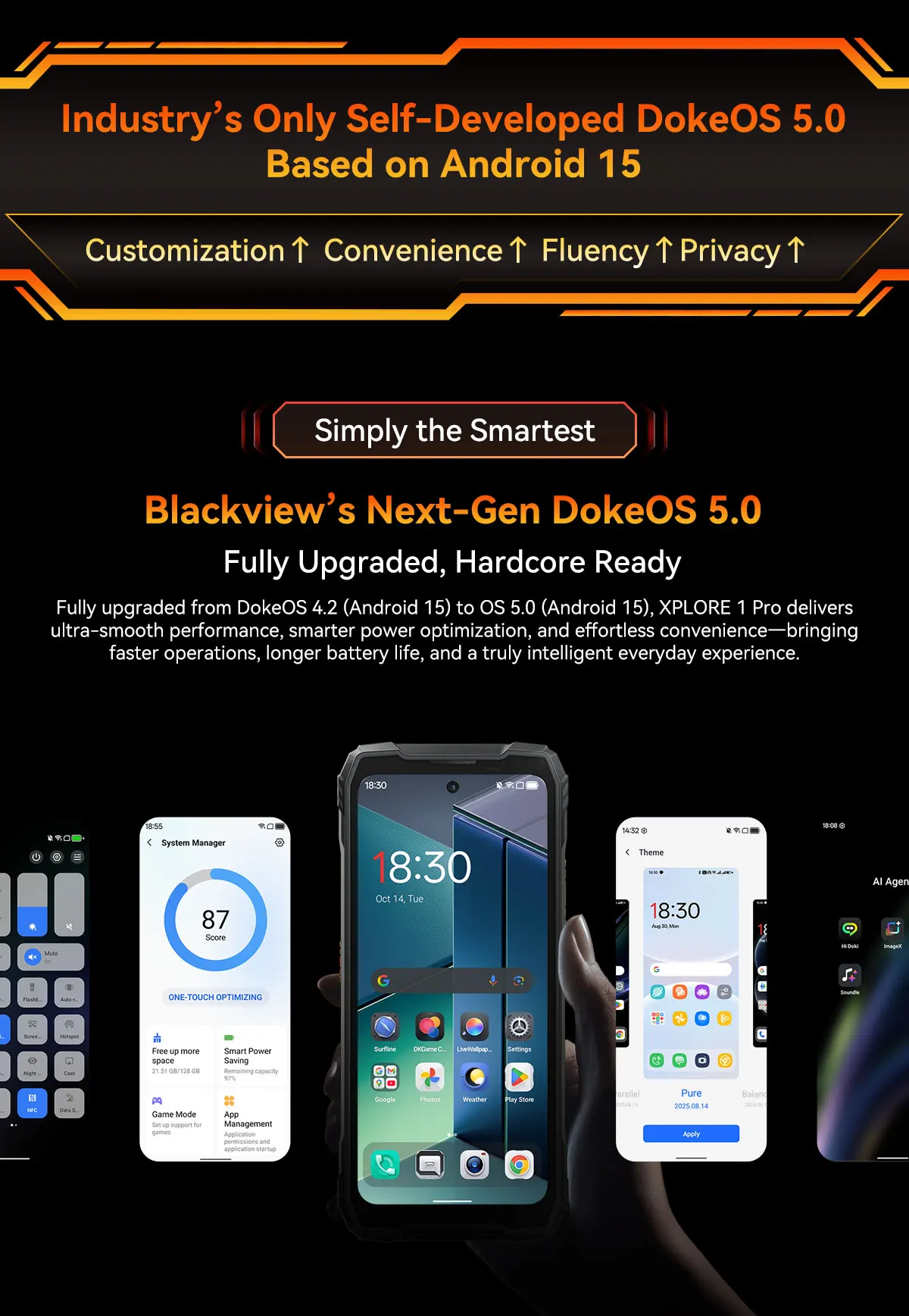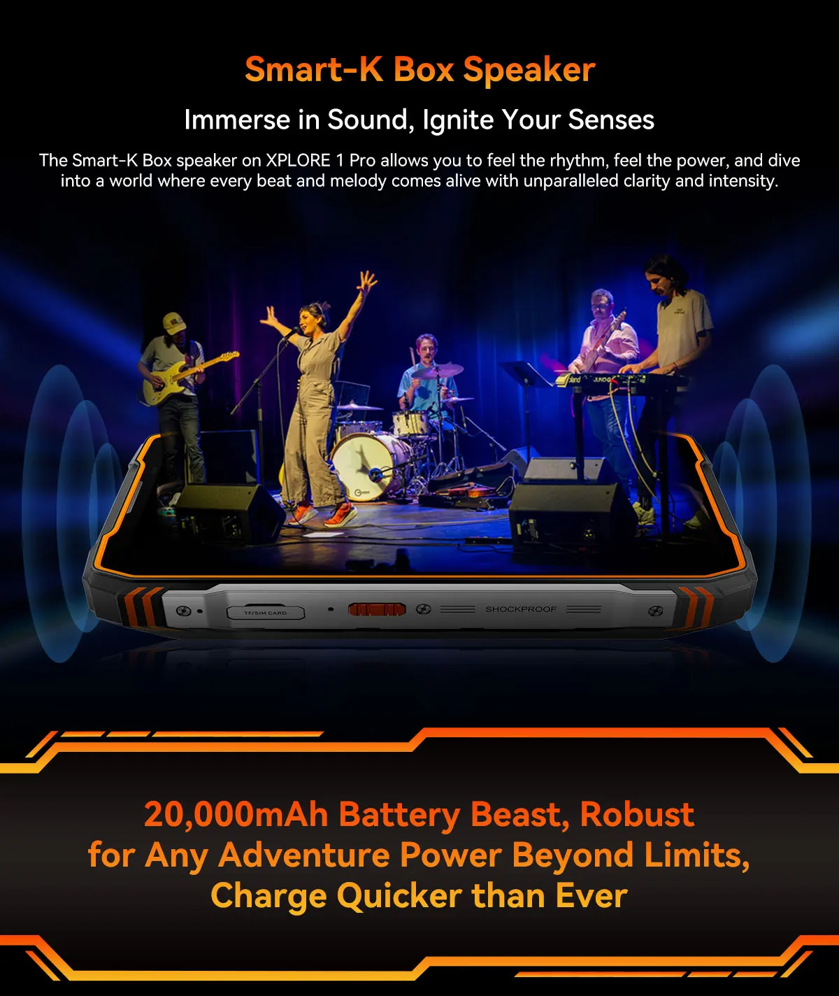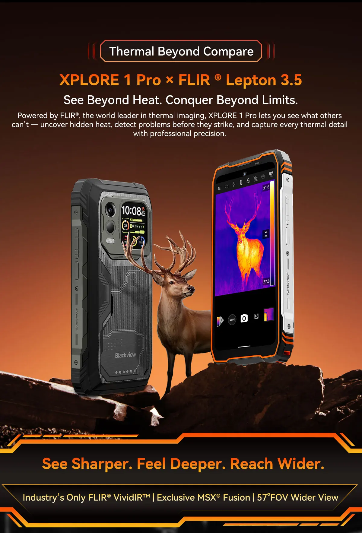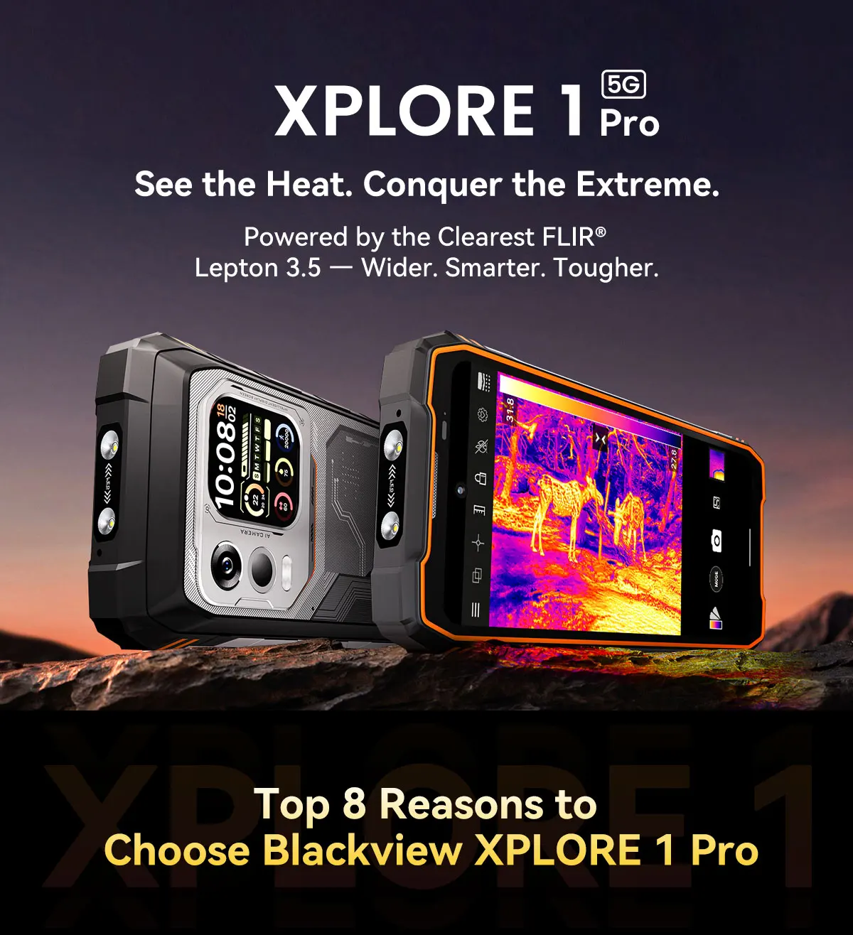 Blackview Xplore 1 Pro Portocaliu: Telefon rugged 5G, DokeOS 5.0 bazat pe Android 15. Are procesor Dimensity 7050, 16GB + 32GB RAM extensibili si 512GB ROM. Ecran principal 6.78" FHD+ 120Hz si ecran secundar 2.01". Camere puternice: 64MP + 20MP Night Vision (spate), 50MP (fata). Baterie 20000mAh cu incarcare 55W. Include camera termica FLIR, NFC, Wi-Fi 6 si protectie IP68/IP69K.