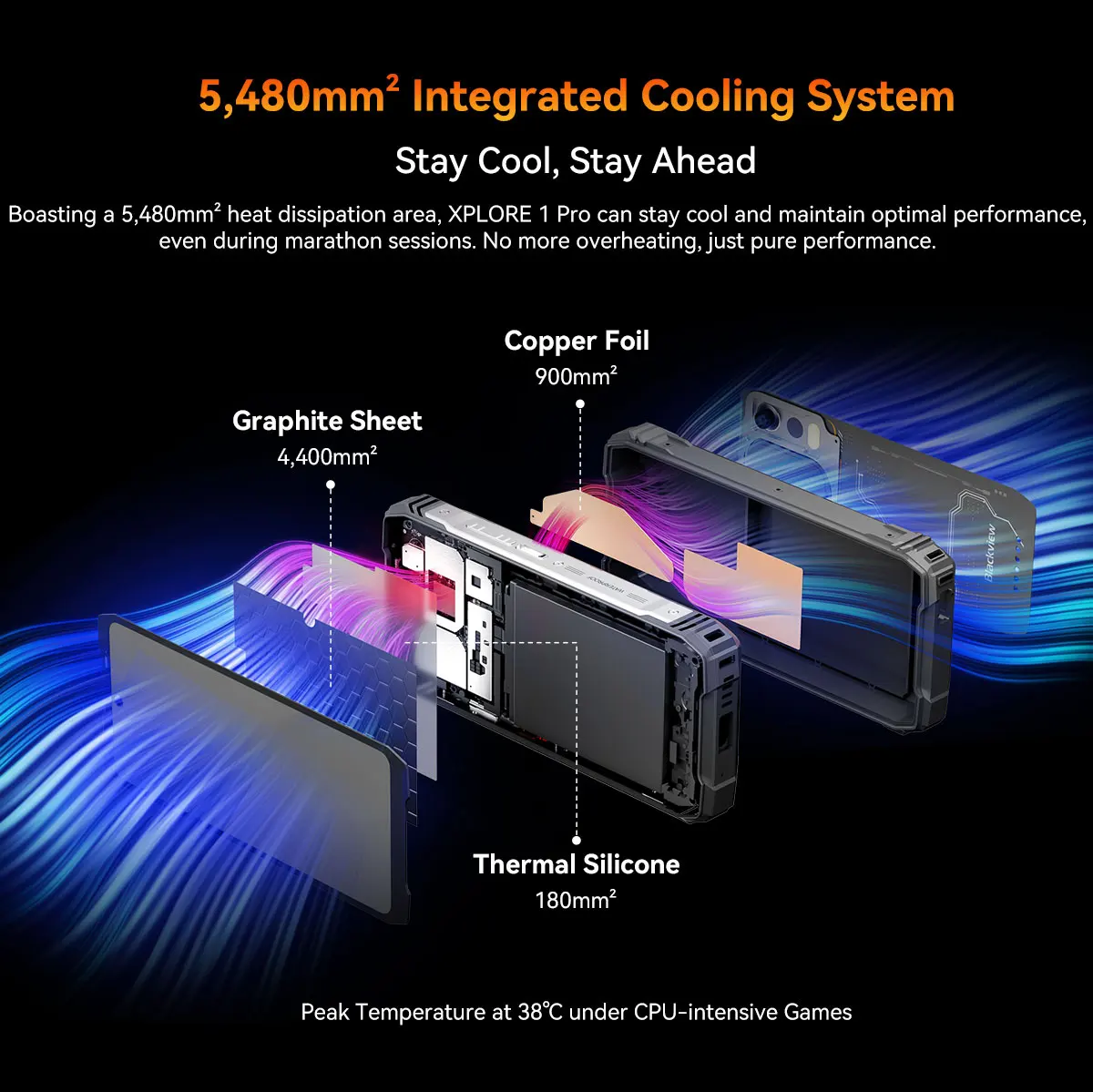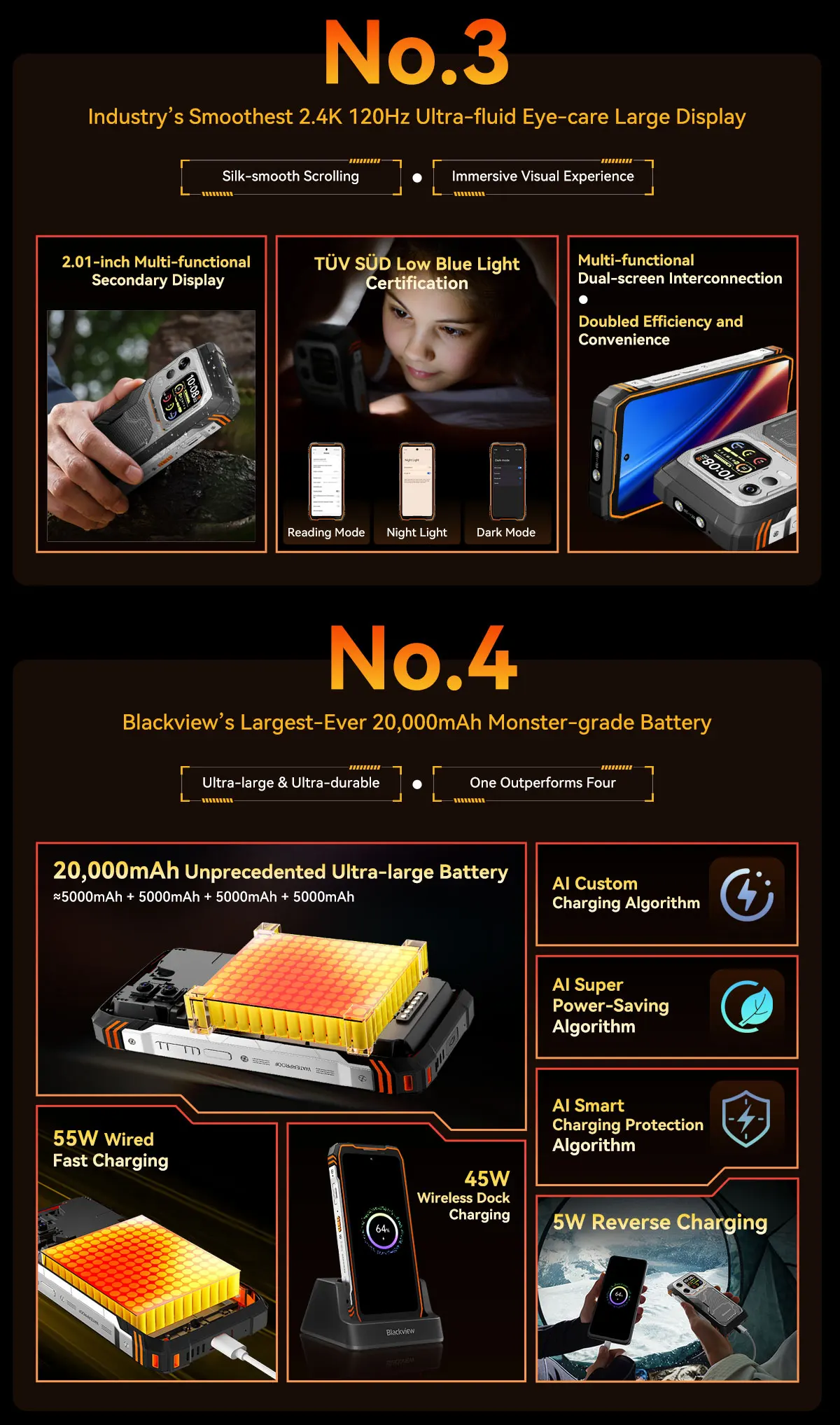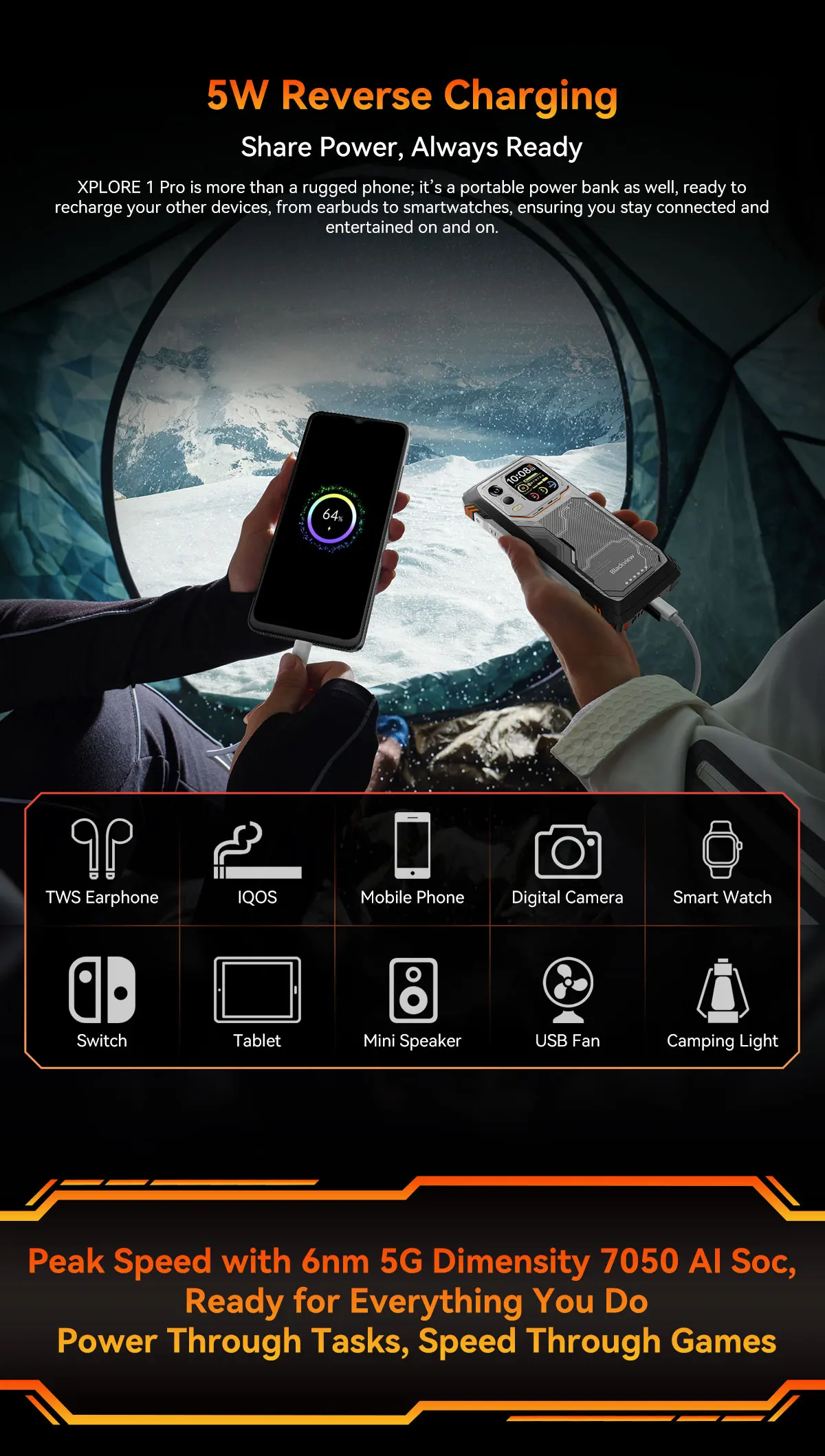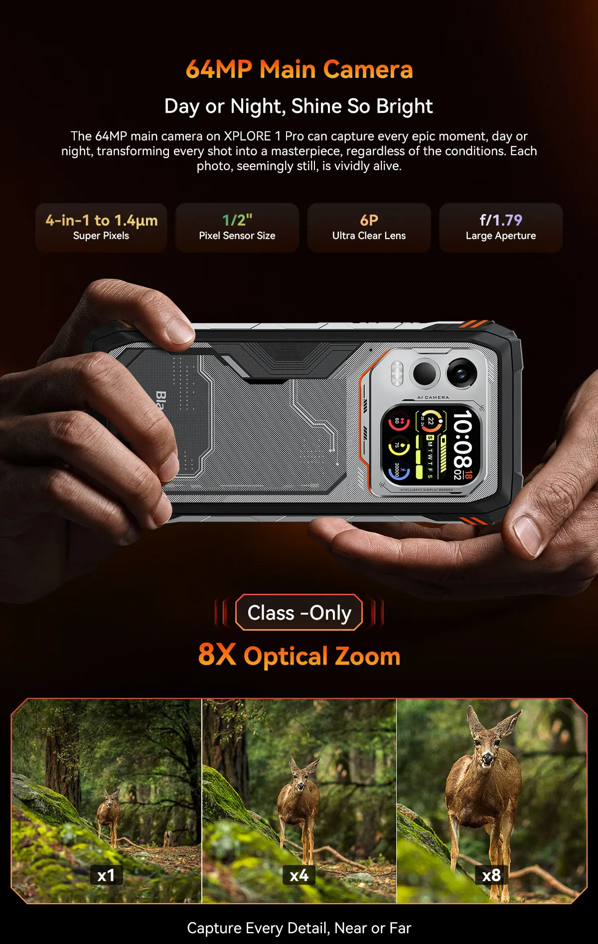Blackview Xplore 1 Pro Portocaliu: Telefon rugged 5G, DokeOS 5.0 bazat pe Android 15. Are procesor Dimensity 7050, 16GB + 32GB RAM extensibili si 512GB ROM. Ecran principal 6.78" FHD+ 120Hz si ecran secundar 2.01". Camere puternice: 64MP + 20MP Night Vision (spate), 50MP (fata). Baterie 20000mAh cu incarcare 55W. Include camera termica FLIR, NFC, Wi-Fi 6 si protectie IP68/IP69K.